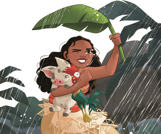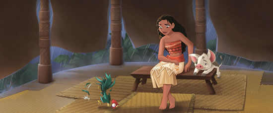 Un día, una violenta tormenta estalló en Motunui. —Así es imposible trabajar —dijo Vaiana a sus amigos Heihei y Púa—.