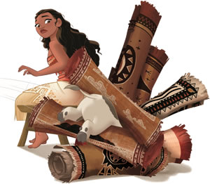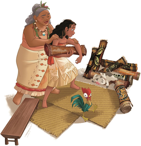 El estruendo que causaba asustó a Púa, que intentó esconderse entre los rodillos de corteza que contenían las leyendas preferidas de la abuela Tala. Vaiana corrió a ordenarlos enseguida.
