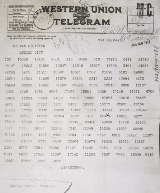 Los británicos contaban con que la embajada alemana en Washington D. C. enviaría el mensaje contenido en el telegrama a su embajada en Ciudad de México, posiblemente mediante el sistema telegráfico estándar, de hecho, se envió por medio de la Western Union, para evitar las posibles sospechas americanas, dado que ambos países no estaban enfrentados. Los agentes británicos consiguieron una copia del telegrama en la oficina de telégrafos de Ciudad de México y la suerte los acompañó pues este estaba cifrado con un sistema viejo que los ingleses podían descifrar completamente (véase Figura 17).