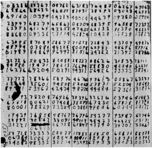 Después de hacer esta sustitución, las cifras se agrupaban de cinco en cinco y a cada una de ellas se le sumaba una serie de números aleatorios, que pueden verse en la Figura 18. Dado que los mensajes eran fundamentalmente tácticos, eran muy cortos, por lo que la longitud de la clave era la misma que la del mensaje, pero no era de uso único, incumpliendo así una de las hipótesis necesarias para que el teorema de Shannon se verificara.