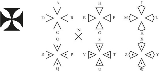El método consistía en una cuadrícula de 5×5, como la que se muestra en la tabla de Polibio, pero con dos diferencias: la primera es que las veinticinco letras se distribuían al azar, o acordadas entre emisor y receptor mediante una clave compartida, y en lugar de emplear números en la parte externa de la tabla, se escribían las letras ADFGX, como se muestra en la tabla ADFGX. En este caso, vamos a seguir la notación contraria a la que es habitual cuando se presenta este método, dado que hemos acordado que, a lo largo de este libro, los textos claros los escribiremos con letras mayúsculas y los cifrados con letras minúsculas y en cursiva. De ahí que las letras exteriores las escribamos en minúsculas y en cursiva. La razón de que Nebel eligiera las letras ADFGX se debe a que son muy diferentes en su codificación con el alfabeto Morse, lo que evitaba, en gran medida, los errores a la hora de transmitir los mensajes por telégrafo.