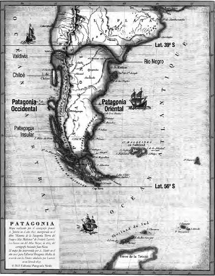 3 Mapa realizado por el cartógrafo francés A. Jenotte en el año 1841, incorporado en el libro Historia de la Patagonia, Tierra del Fuego e islas Malvinas, de Frederic Lacroix. Los barcos son del atlas mayor, de 1665, del cartógrafo holandés Joan Blaeu. El mapa fue intervenido por Alberto Montt en el año 2007 para Editorial Patagonia Media, de acuerdo con los límites señalados por Lacroix en su libro de 1841. © 2011, Editorial Patagonia Media.