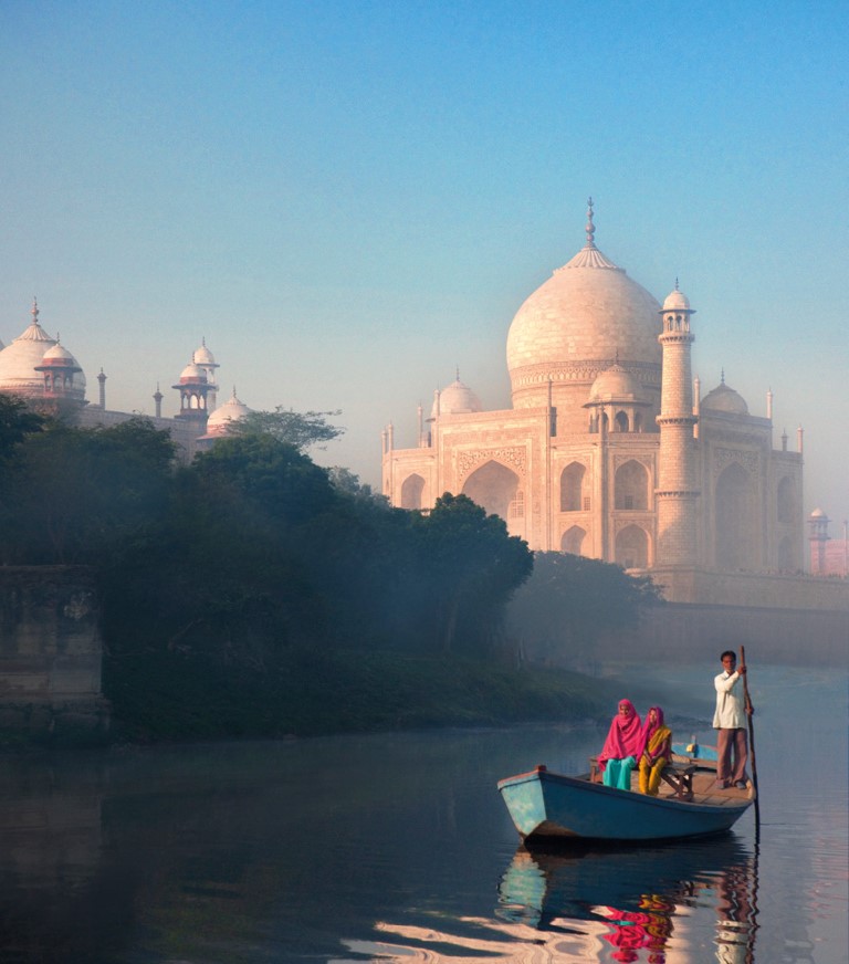 El Taj Mahal, en la India, al amanecer, visto desde el río.