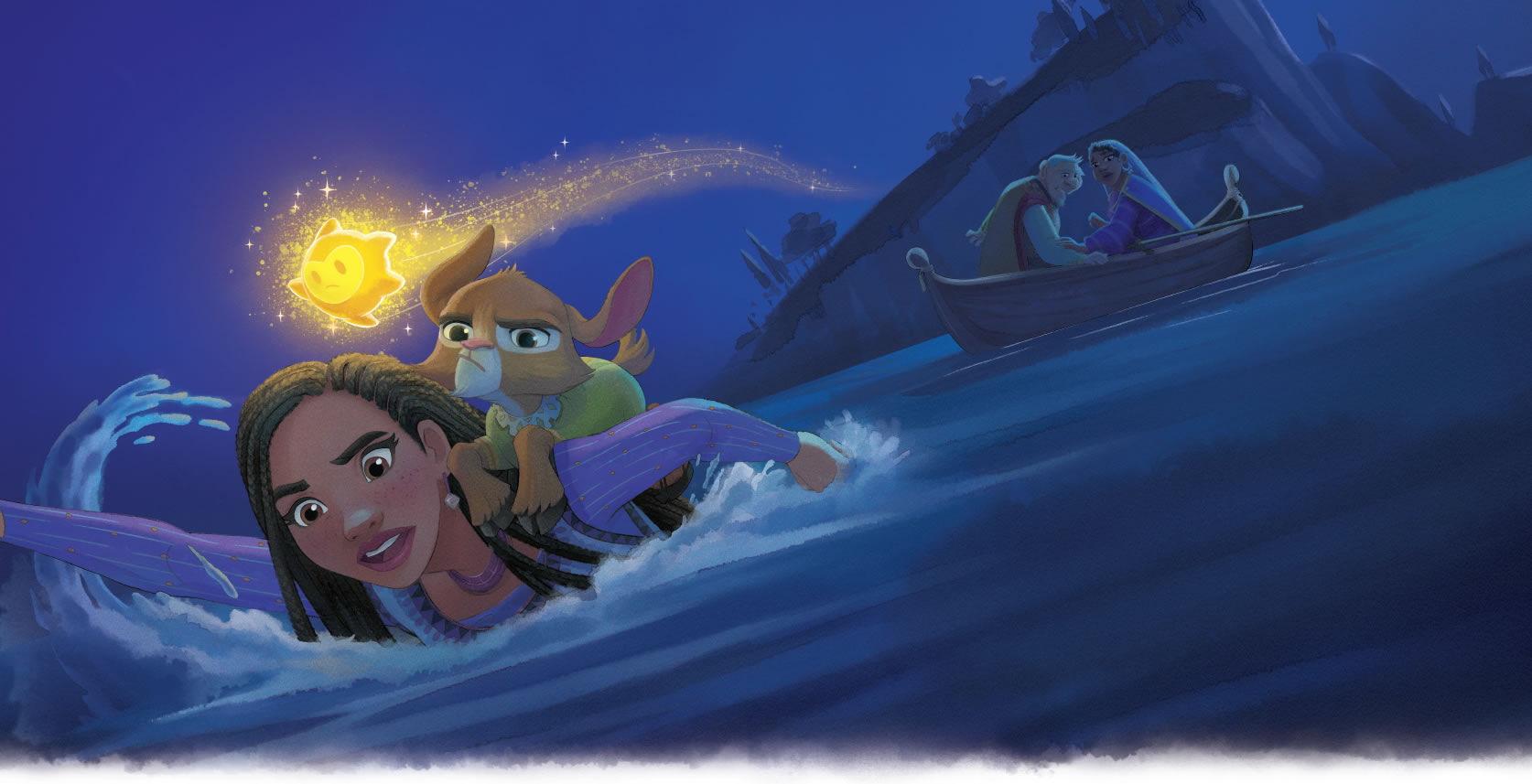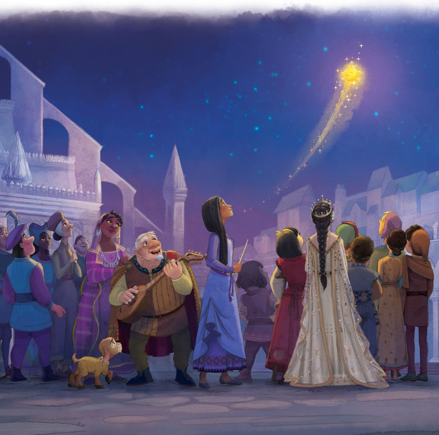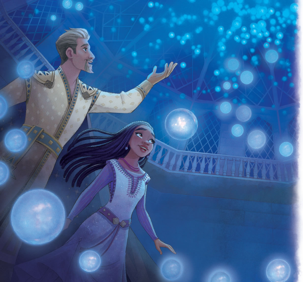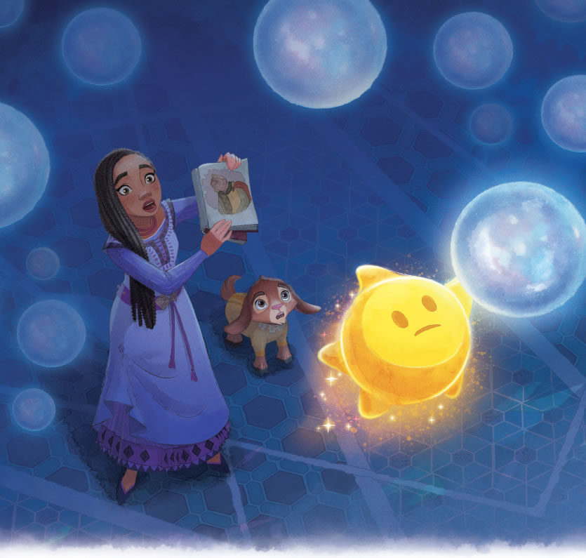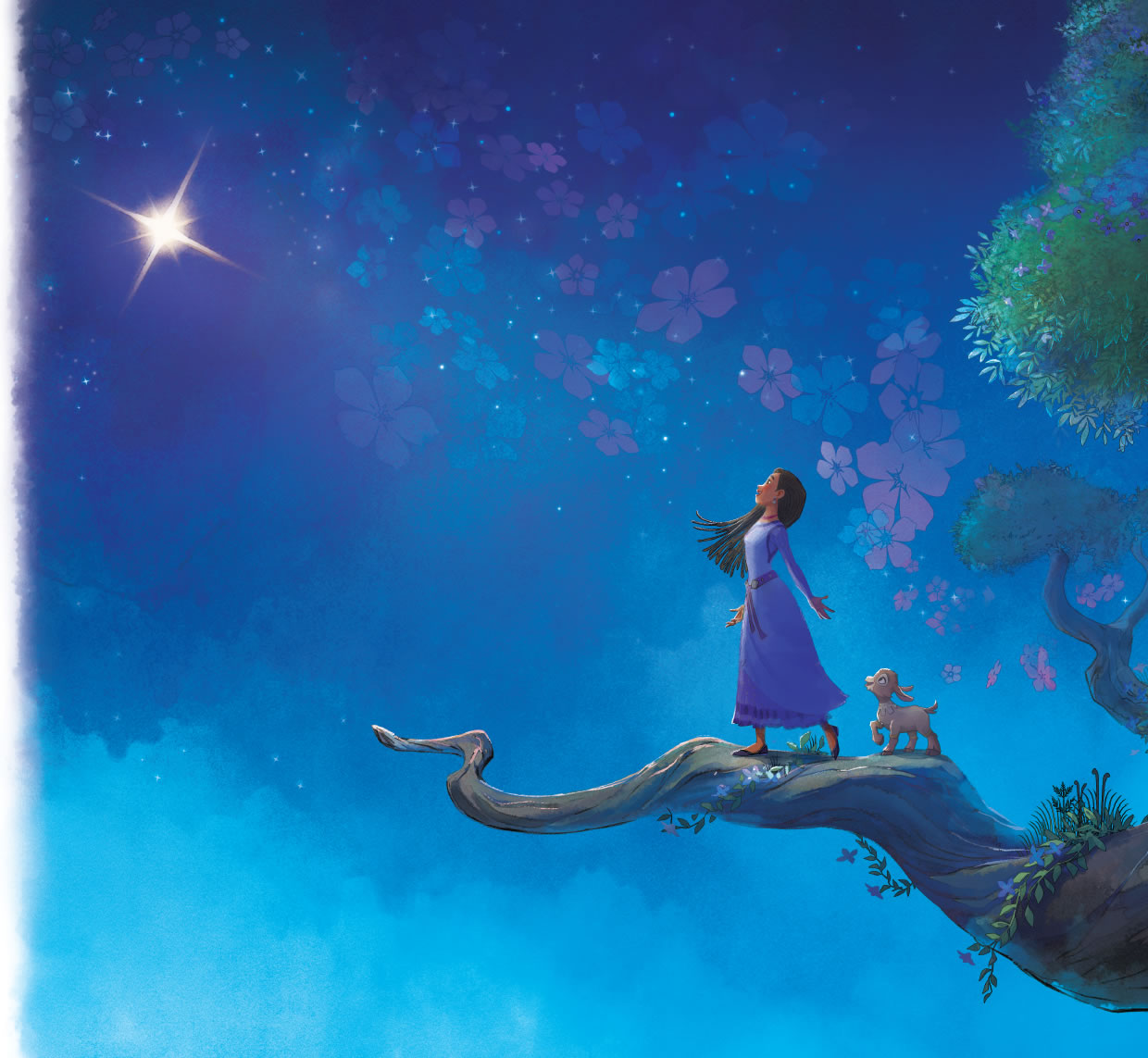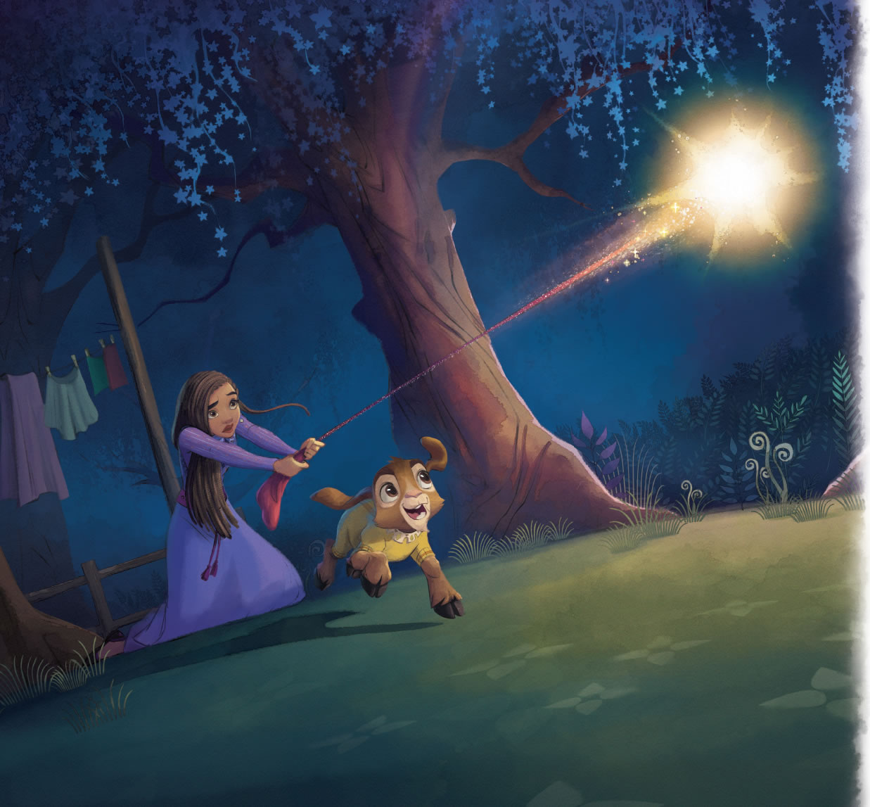 Asha miró al cielo nocturno y vio una estrella que brillaba más que las otras. Acompañada de Valentino, se subió al árbol en el que solía soñar con su padre. Mientras miraba aquella estrella tan bonita, la joven compartió su mayor sueño: que todo el mundo tuviera la oportunidad de hacer realidad sus deseos.
