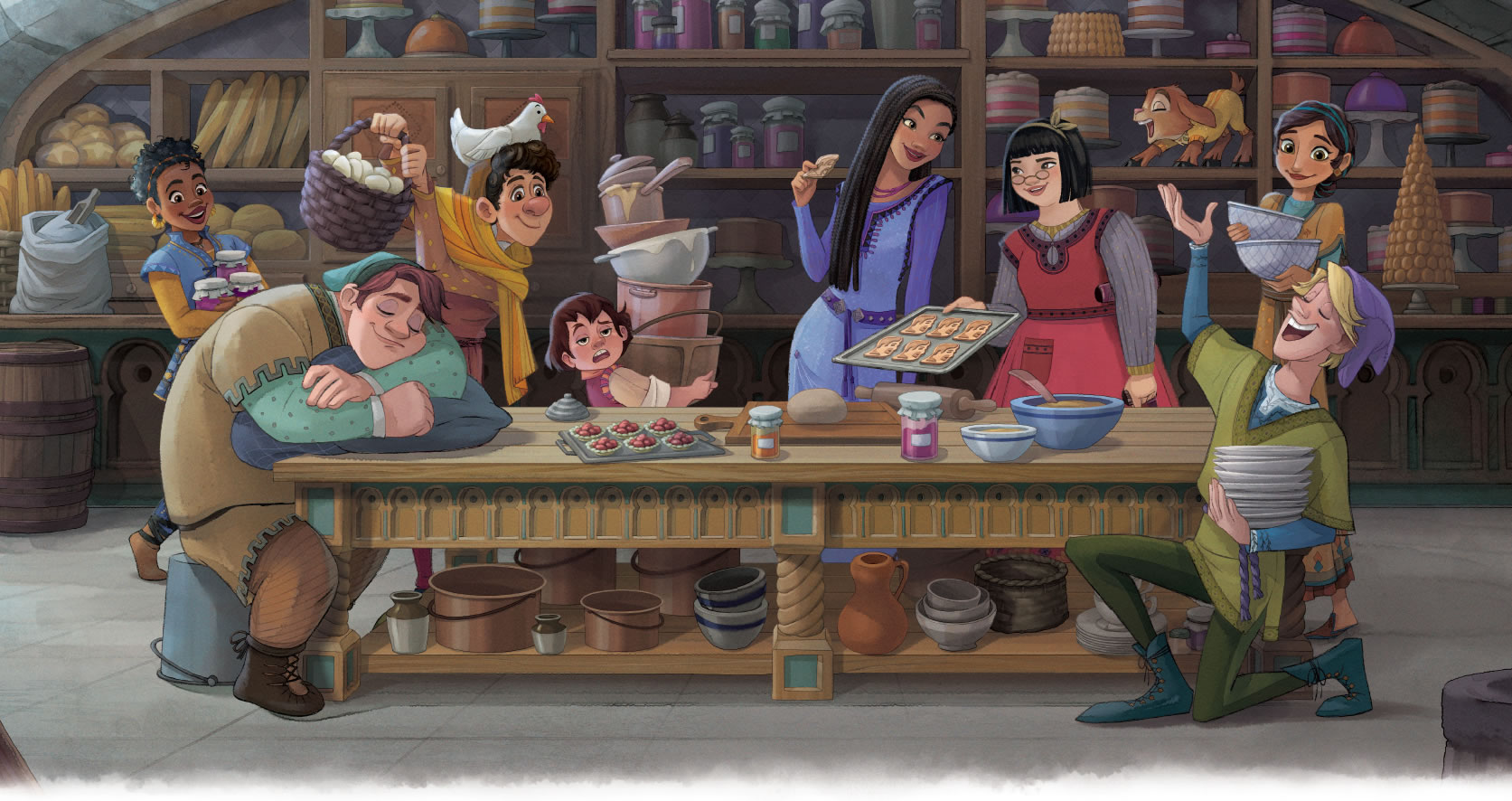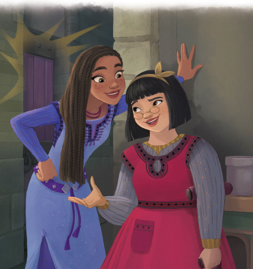 Después del recorrido turístico, Asha fue a las cocinas del castillo a ver a su mejor amiga, Dahlia, que era una magnífica repostera. Asha aún no se lo había dicho a su familia, pero Dahlia y el resto de sus amigo sabían que se había presentado para ser la aprendiz del rey.