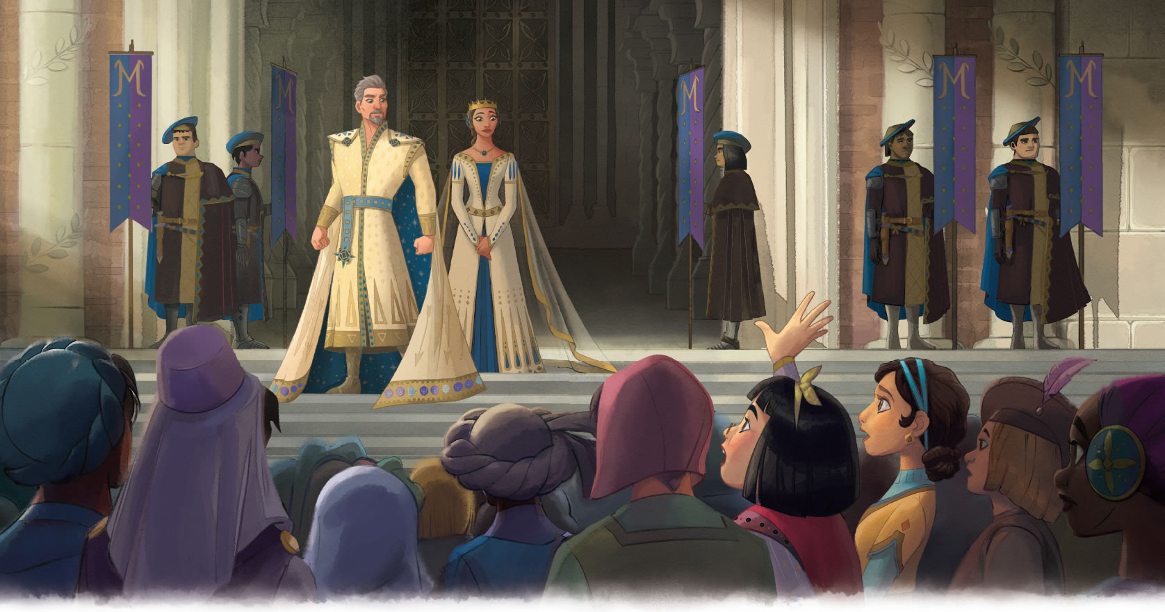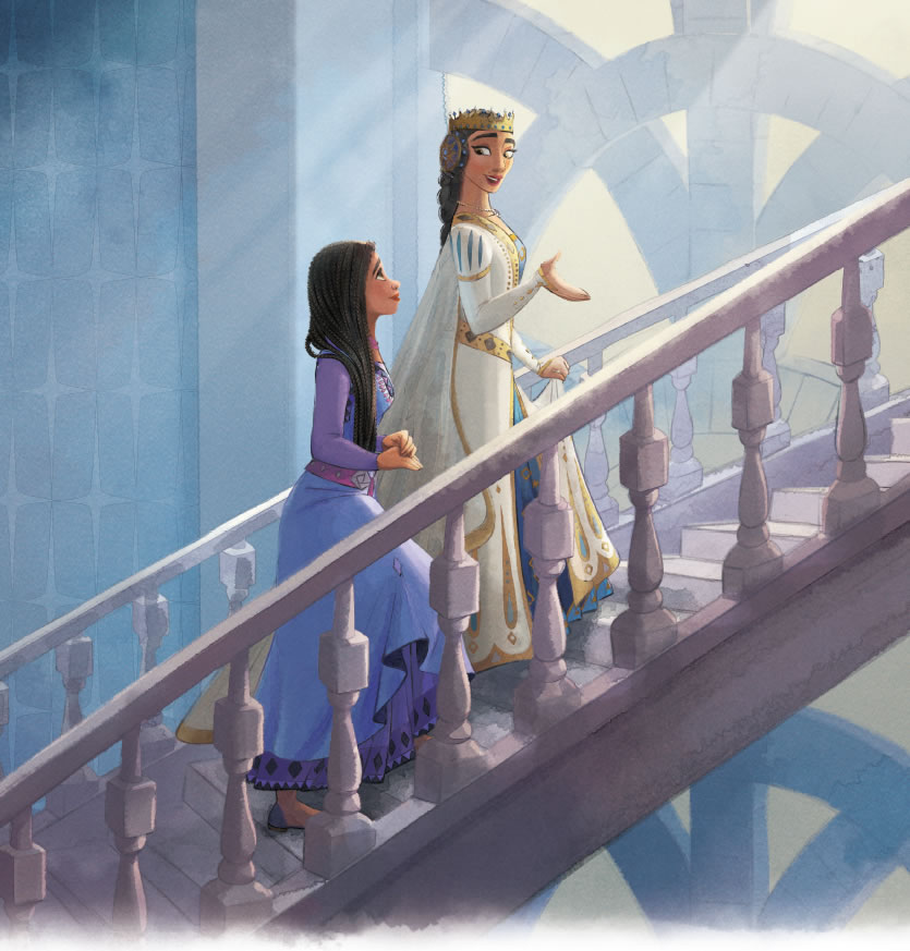 Mientras subían la escalinata del castillo, la reina aprovechó para darle algunos consejos a Asha. Al llegar a la puerta del despacho del rey, la reina se detuvo y le confesó que apostaba por ella.