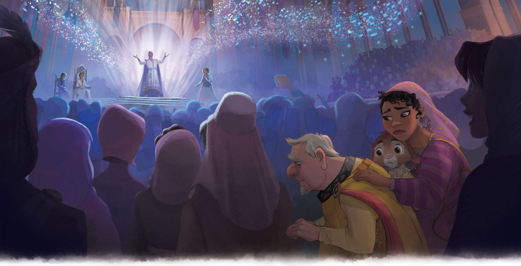 Al empezar la ceremonia, Magnífico recibió los deseos de dos ciudadanos. Asha, que ahora lo veía todo con nuevos ojos, se dio cuenta de que la tristeza ensombreció sus rostros cuando se desprendieron de sus deseos.
