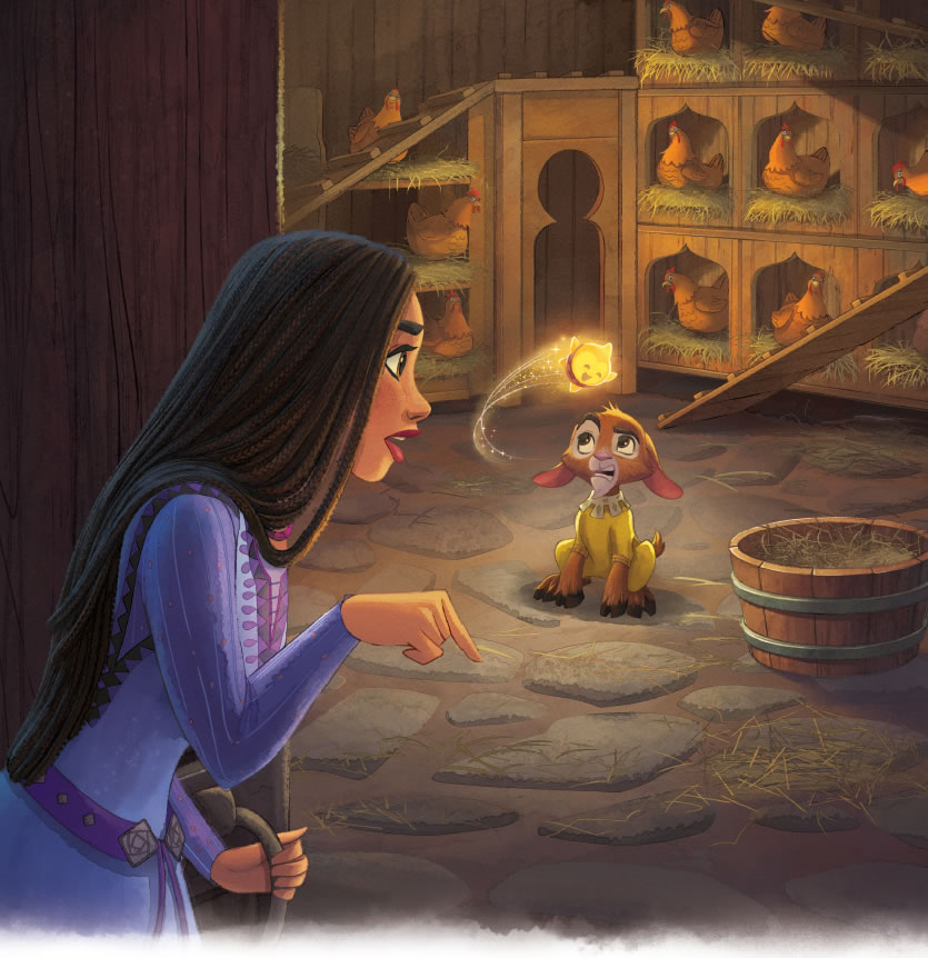 Mientras tanto, Asha sabía que el mundo no estaba preparado para una estrella curiosa y una cabra que hablaba. Así que los metió a hurtadillas en el castillo y los escondió en el gallinero, donde estarían a salvo hasta que hubiera urdido un plan. Asha quería ir a hablar con Dahlia.