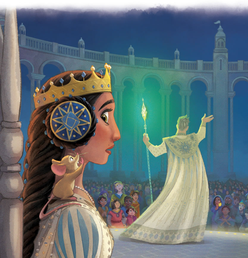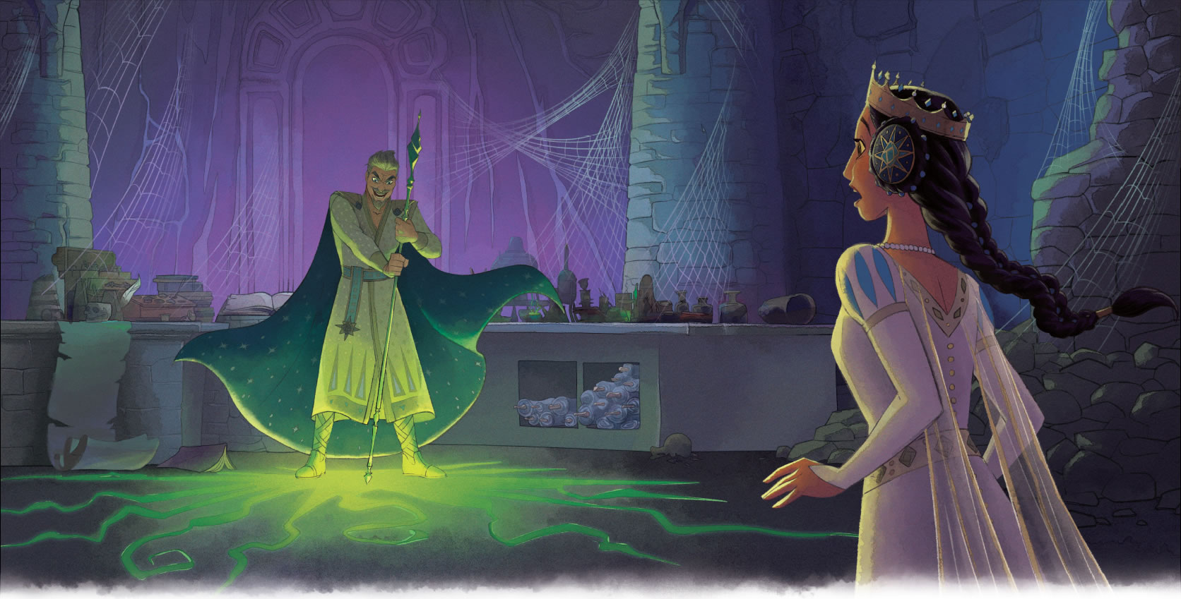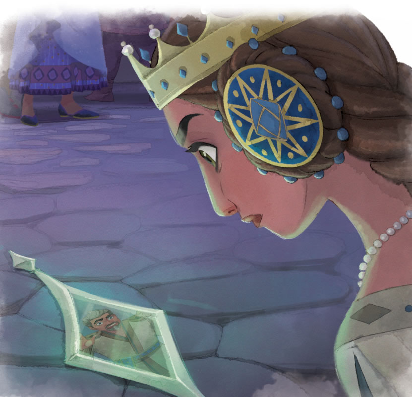 De repente, oyeron una voz. Atrapado en el extremo del cetro, dentro de un espejo, ¡Magnífico pedía que lo liberaran! Cuando Amaya se negó, el rey se impacientó.