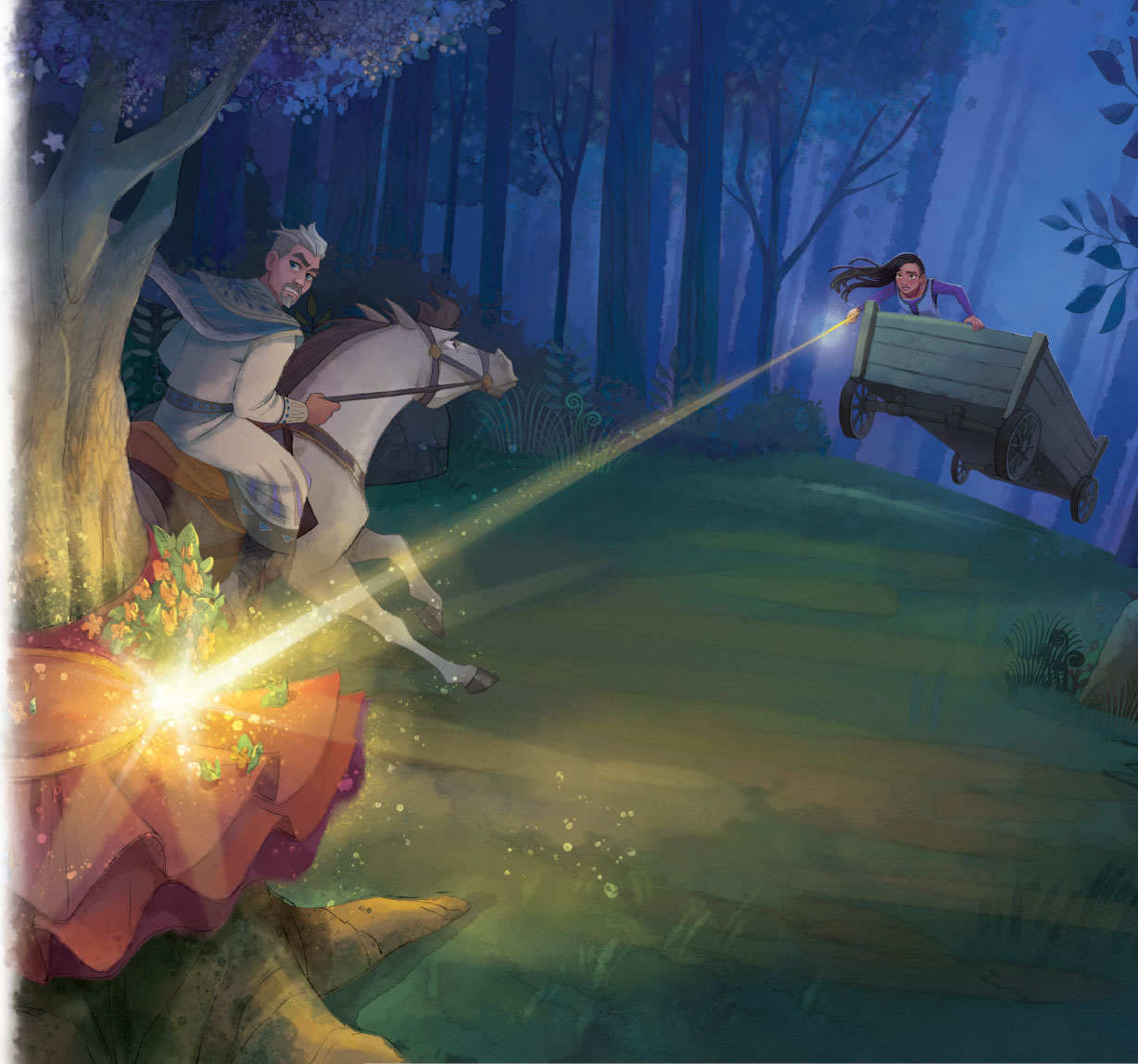 Con el rey pisándole los talones, Asha se montó de un salto en una carreta e intentó defenderse con la varita mágica, pero apuntó mal y acabó poniéndole un vestido a un árbol.