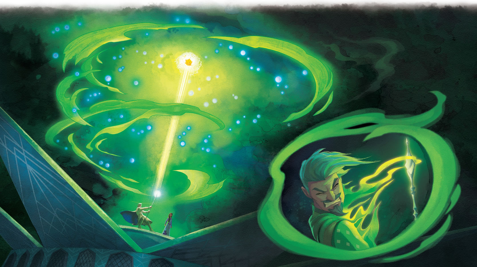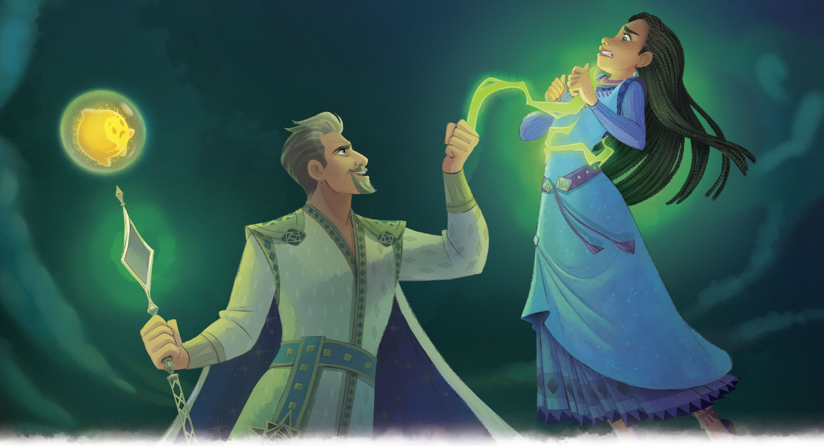 En cuanto Asha llegó al castillo, Magnífico la izó hasta el observatorio con una cuerda de luz verde. Apretó con fuerza los rayos que envolvían a Asha y a Estrella mientras las acercaba a él. Ambas se miraron con desesperación, indefensas ante la poderosa magia del rey.