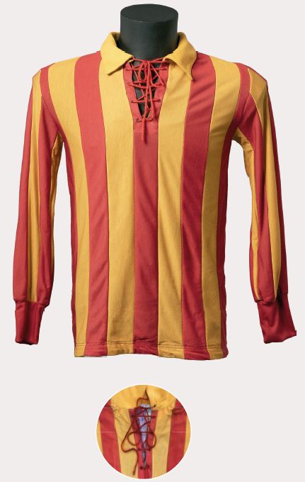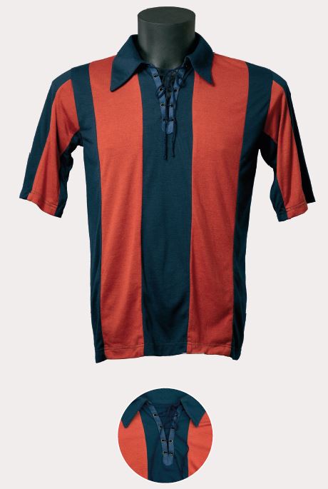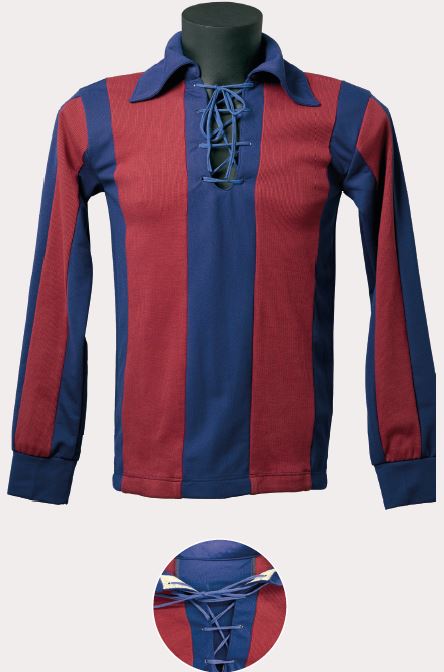 Aquesta és una de les samarretes que van aparèixer entre el 1921 i el 1928, uns anys d’explosió pel que fa a la diversitat de dissenys. Confeccionada amb cotó fi, era de colors saturats i incorporava un escut petit en comparació amb els usuals d’aquella època, que també lluïen les americanes oficials de l’equip. El coll era rodó, sense solapa, cenyit al cos, amb quatre traus a cada banda per als cordons. Els pantalons i les mitges continuaven sent els mateixos.