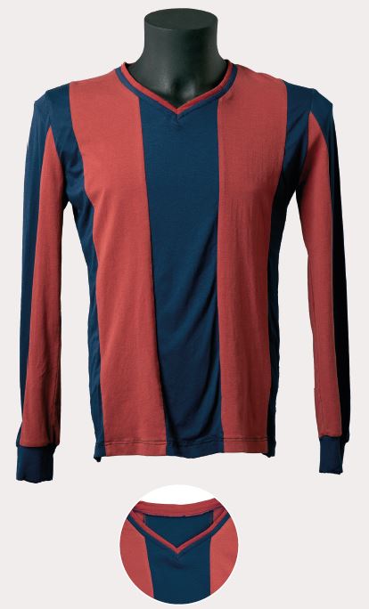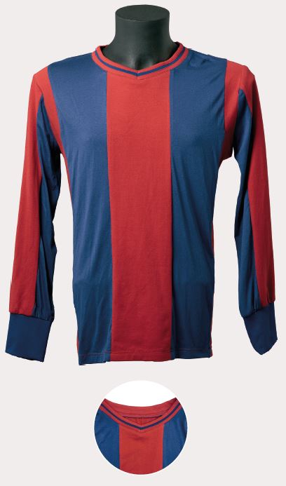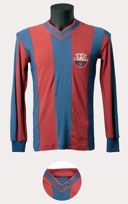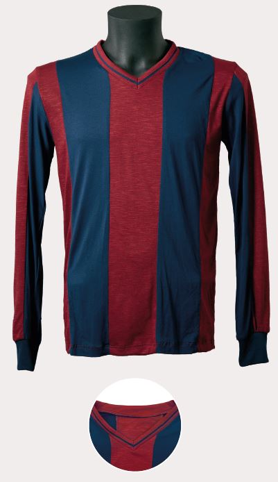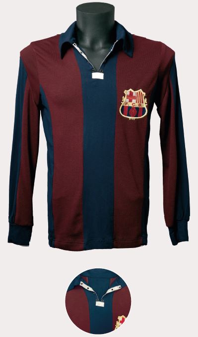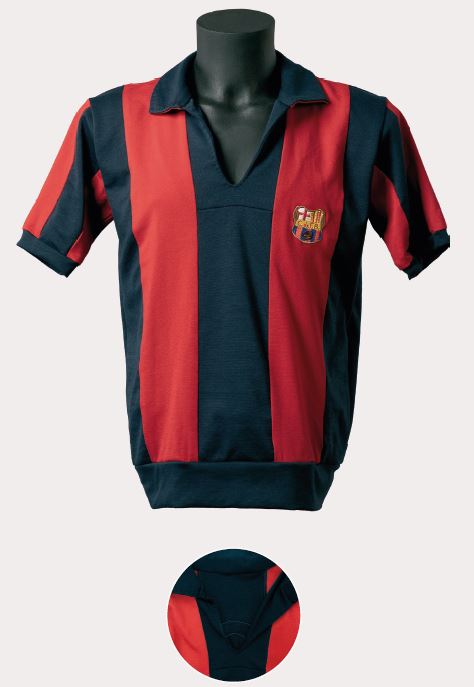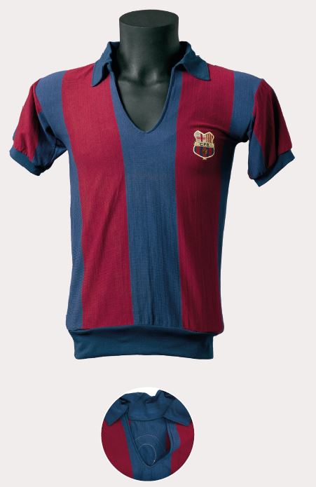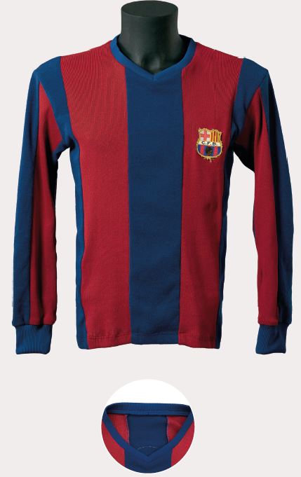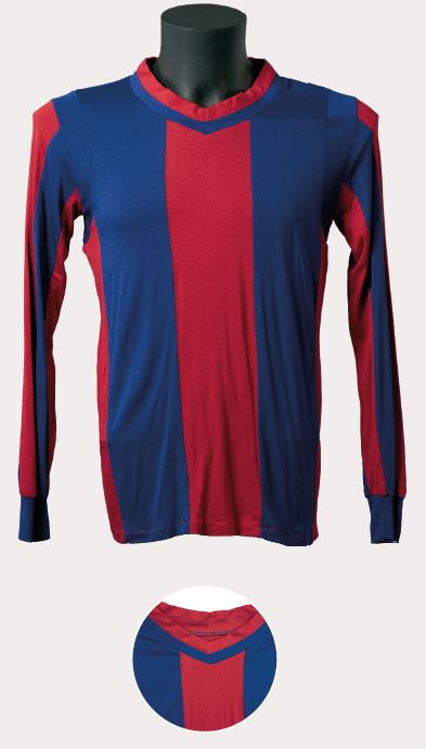 En uns anys de poca variabilitat estètica, va sorgir, al nostre parer, la peça més bonica i harmoniosa d’aquella època. La samarreta era de teixit semigruixut, amb costures estretes a les espatlles, d’un color blau dens i un granat intens. A més, portava diferents reforços cosits, com el que s’aprecia al coll en forma de petit rectangle blanc, i una tira, també blanca, a cada banda interna de l’obertura, un tret que la va fer clarament reconeixible davant de la resta de models d’aquella època. L’escut era únic, brodat i d’estil modernista.