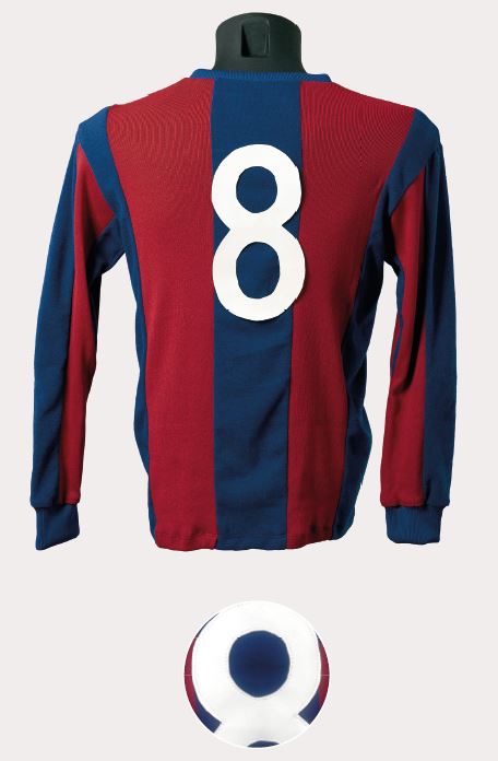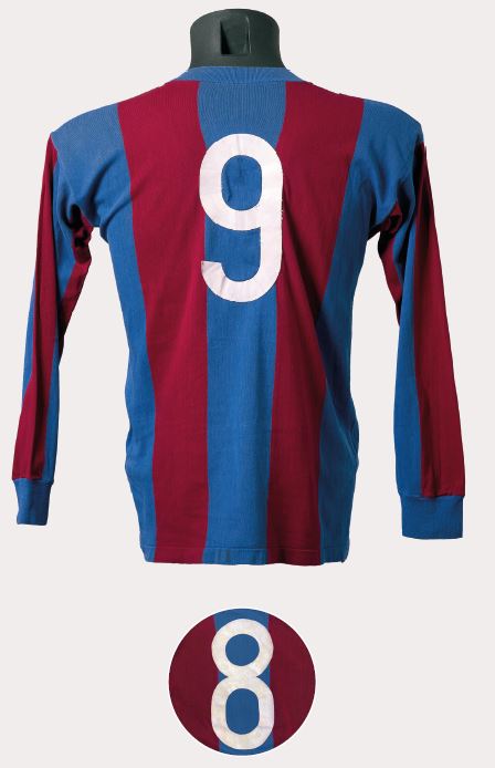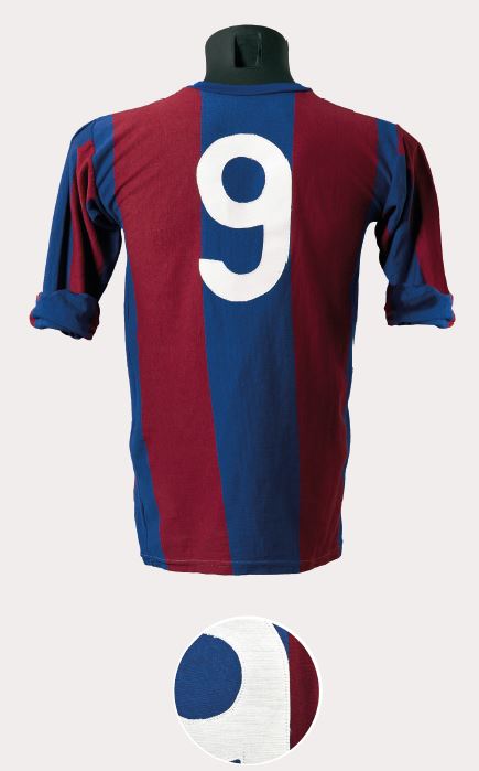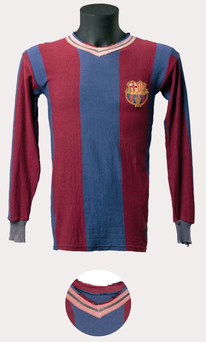 El jugador del retrat és Domènec Carulla, membre del Barça triomfant de la dècada de 1920. A la foto grupal de l’eliminatòria contra l’Sporting de Gijón als quarts de final de la Copa d’Espanya 1923-24, a part d’ell, s’hi aprecia com gairebé tot l’equip vesteix aquesta samarreta. A l’esquerra, Samitier lluita amb un defensor del Sants durant el Campionat de Catalunya de 1923-24.