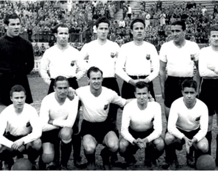 Paco Bru lluint l’espectacular samarreta amb el primer escut del club en la famosa orla de campions del 1910 i l’equip que va jugar contra l’United Hospitals de Londres el 6 de gener de 1911, amb una clara victòria anglesa per 0-4.