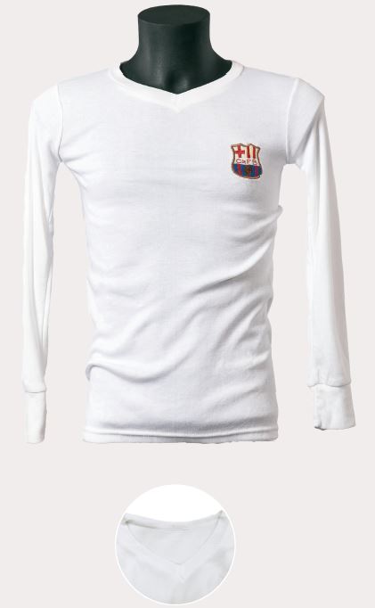 La samarreta era blanca i de cotó, amb el coll de semipunta i, com era habitual en aquella època, de màniga llarga. Algunes peces portaven l’escut modernista de l’època brodat. Era una samarreta blanca, bàsicament perquè era oposada als colors habituals del club, i així no es confonia amb l’equip rival. Els pantalons eren negres, les mitges del mateix color i, habitualment, amb dues franges blanques a la vora.