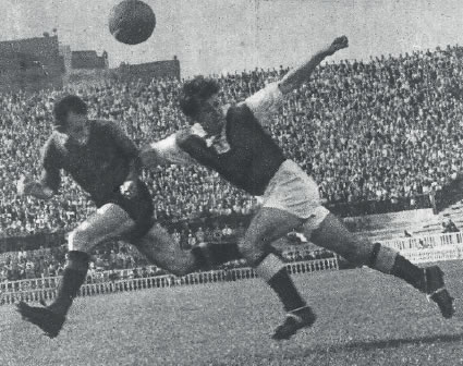 Samitier i Alcántara (drets), amb la samarreta cordada i descordada respectivament. Amb la pilota a punt de xutar, l'anomenat trencaxarxes, durant el Campionat de Catalunya 1923/24.