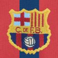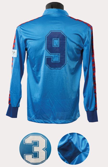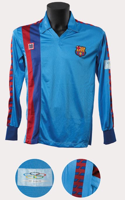 Aquesta joia de samarreta va ser insòlita per al Barcelona, perquè era la primera vegada que una indumentària blaugrana portava un distintiu que no estava estrictament relacionat amb el club. I quin distintiu! Va ser ni més ni menys que el logotip de la candidatura de la ciutat de Barcelona per als Jocs Olímpics del 1992. Aquest emblema era senzill, de vellut i anava enganxat sota l’escut. Fora d’això, la peça era la mateixa que la clàssica, encara que en aquella època sempre hi havia petits detalls que les feien una mica diferents entre si, com les tintades o els acabats. Només es va fer servir a la temporada 1985-1986 i no es van guanyar títols.
