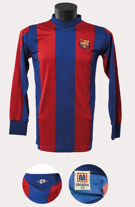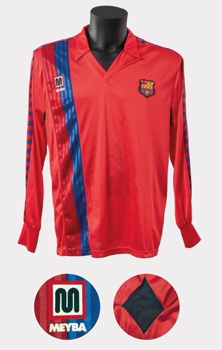Als anys vuitanta i amb Meyba, va arrencar una nova era de samarretes. Meyba és una marca catalana creada en la dècada de 1940 per Josep Mestre i Joaquim Ballbé (Me y Ba). El 1979, el somni de tots dos creadors es va fer realitat en aconseguir vestir el FC Barcelona, un dels millors equips del món. Després en vindrien d’altres, com el Valladolid, l’Osasuna, l’Atlètic de Madrid, el Cadis, el Betis, el Múrcia, el Lleida, l’Espanyol, l’Andorra, el Sabadell, el Figueres, el Nàstic de Tarragona, la Damm, el Rayo Vallecano, l’Eibar, l’Oviedo, l’Alavés o el Racing de Santander. Per a la primera samarreta, Meyba va mantenir una línia continuista respecte de la història blaugrana, però amb algunes millores. La més destacada va ser el teixit sintètic, més lleuger i flexible. Cal recordar que quan la samarreta Mont-halt estava suada, s’amarava i pesava el triple, mentre que amb Meyba es va aconseguir una transpiració millor. El dorsal era serigrafiat i no portava cap detall que revelés la marca del fabricant, tret de l’etiqueta.