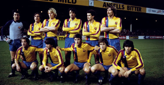 Estella, defensor del Barça al començament dels anys vuitanta, en la derrota de Pamplona de l’any 1982, seguit de Migueli, estès a terra i sagnant després de l’agressió del rival, que va acabar amb tres punts de sutura. A continuació, Quini i Krankl en un entrenament durant la temporada 1980-1981, on es pot veure el model creat per Meyba, que no lluïa la sanefa a les espatlles ni el logotip al pit, i que només es va fer servir en els entrenaments.