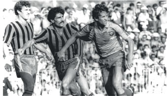 Sagi i Piera abraçats, uns minuts abans de l’inici del partit. A dalt, Alcántara competint amb el seu icònic mocador blanc als pantalons.