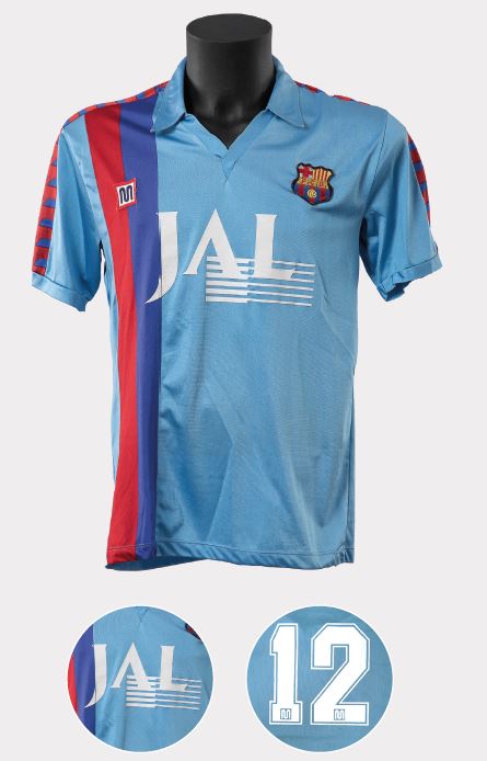 La temporada 1990-1991, el club va acceptar viatjar al Japó per disputar un parell de partits corresponents a la minigira nipona contra una selecció de la Lliga d’aquell país; era la primera vegada que el Barça trepitjava terres japoneses. L’acord comercial implicava que el club blaugrana havia de fer publicitat a la samarreta, però Núñez no estava disposat a tacar-la, així que es va decidir utilitzar el segon equipament, la celeste. Els japonesos van imprimir el logotip JAL (Japan Airlines) en pelfa en els dos partits, que van acabar amb victòria celeste (4-2) i empat (1-1). Els ingressos d’aquella gira van servir per finançar el fitxatge de Ronald Koeman, que havia aterrat feia uns mesos per l’escandalosa quantitat de 780 milions de pessetes (gairebé 5 milions d’euros de l’època).