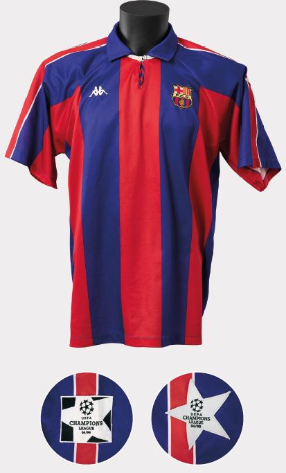 Aquesta samarreta era pràcticament la mateixa que la de la temporada 1993-1994, però amb l’aplicació de la normativa UEFA i, per tant, sense les marques d’aigua ni els logotips a les mànigues. També canviava el dorsal, que va passar a ser serigrafiat o sublimat, segons el partit. Amb els emblemes de la competició va passar el mateix, es va utilitzar tant el d’estrella com el quadrat de color plata i negre.
