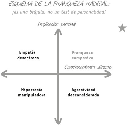 Utiliza el esquema de la FRANQUEZA RADICAL como una brújula para encarrilar las conversaciones individuales por el buen camino. Pero, por favor, no lo uses como un test de personalidad para juzgarte a ti mismo o a otras personas. No escribas nombres en los cuadrantes. Todos caemos en distintos de ellos varias veces al día.
