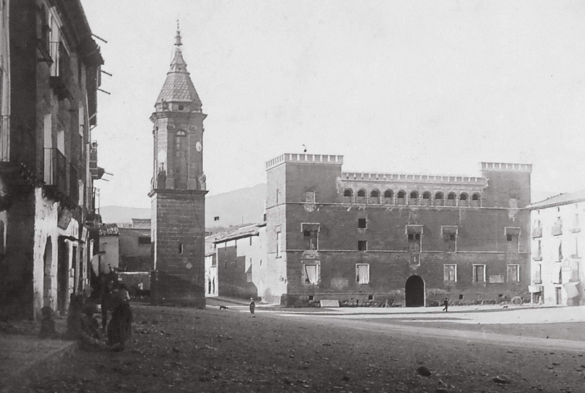 Plaza de Ayerbe con la Torre del Reloj. Fotografía de Santiago Ramón y Cajal. En este municipio aragonés Cajal pasó su infancia y parte de su juventud; lo consideraba «su patria chica».