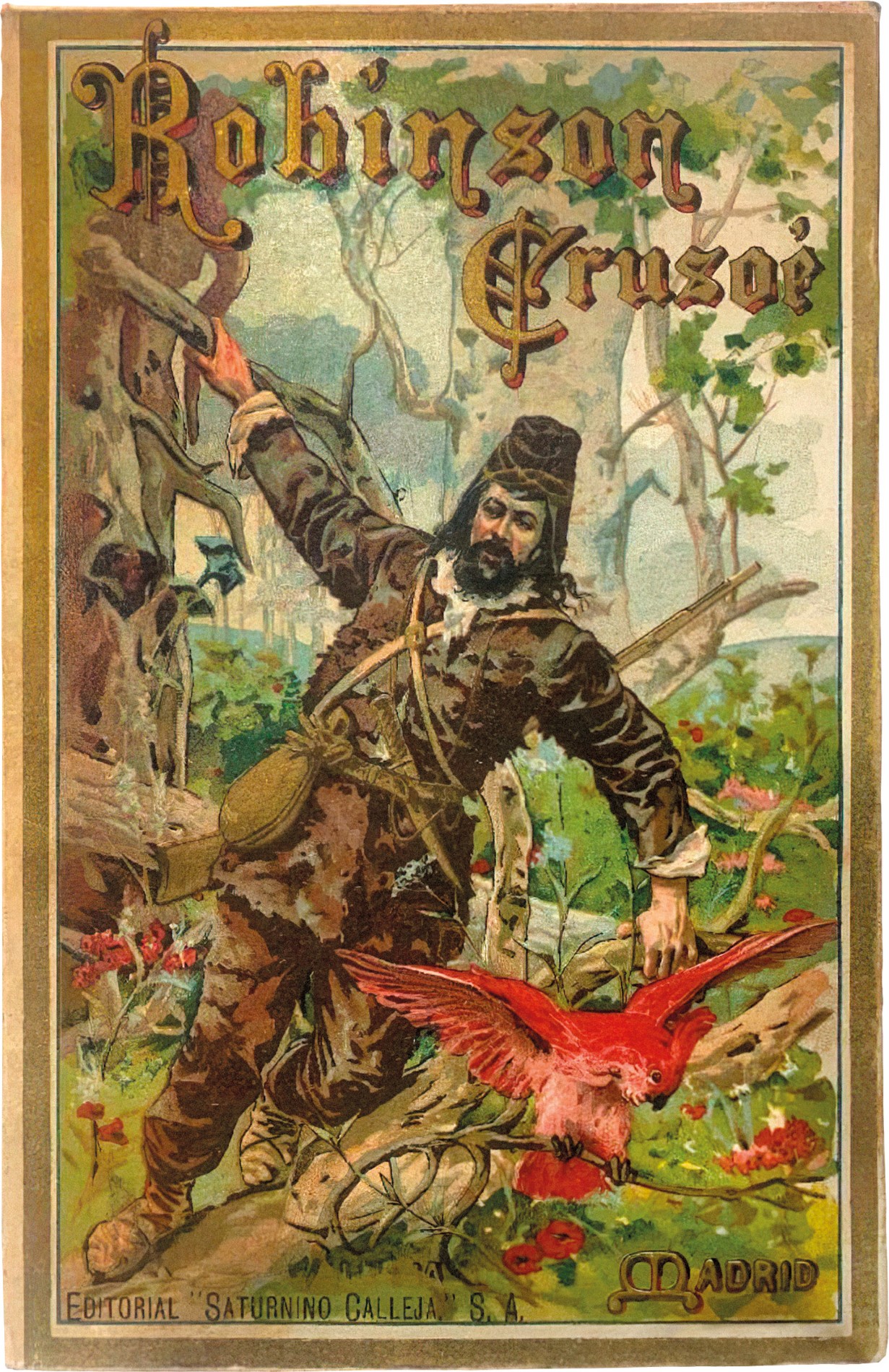 Portada de Robinson Crusoe, de Daniel Defoe, novela de aventuras que impactó al joven Cajal, posiblemente basada en la historia real de un marinero español que sobrevivió ocho años en una remota isla tropical.
