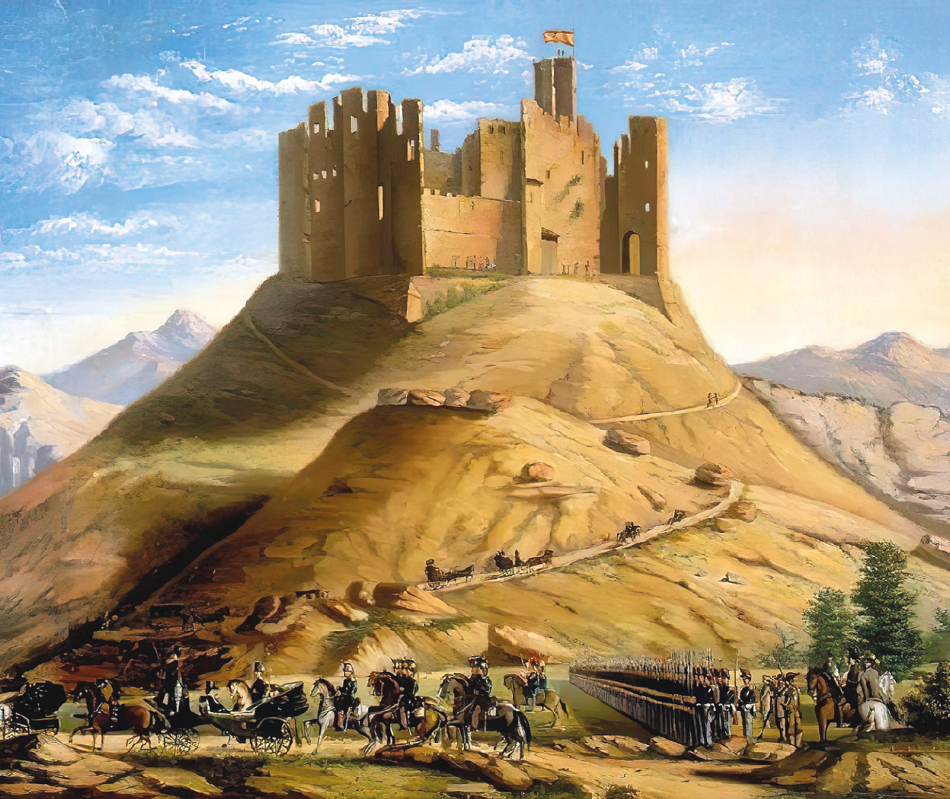 La parada del ejército de Isabel II en el castillo de Montearagón, obra de León Abadías, 1859. El joven Cajal recibió clases particulares de dibujo de León Abadías, discípulo de Federico Madrazo.