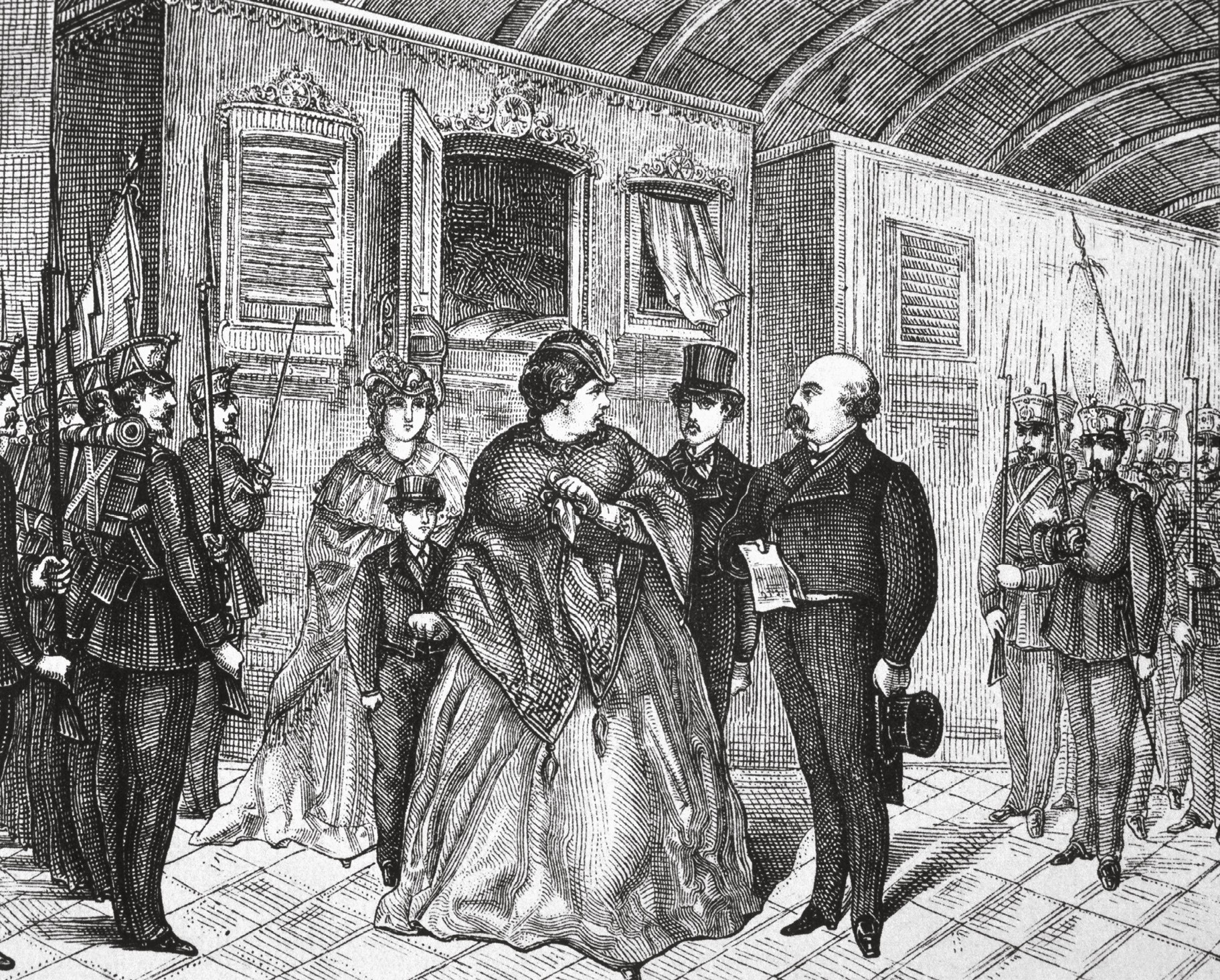 Partida de la reina Isabel II hacia el exilio en Francia. Grabado de 1869. Cajal vivió en Ayerbe la Revolución de 1868 que supuso el derrocamiento y exilio de Isabel II.