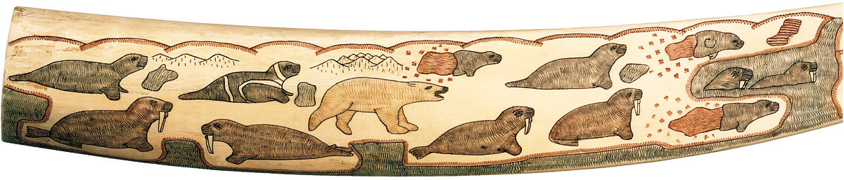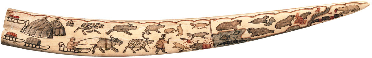 40. Carved walrus tusk in colour (primary face). Chukchi, Chukchi Peninsula, 1930s. Walrus ivory, length: 62 cm, width: 6 cm.