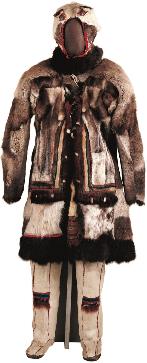 12. Yukaghir man’s costume. Yakutia, Kolyma Oblast. Incorporating the skins and furs of reindeer, seal, dog, wolverine and squirrel; linen and cotton cloth; reindeer hair; and glass beads. Coat length: 100 cm; circumference at the chest: 86 cm; at the trouser-legs: 22 cm.