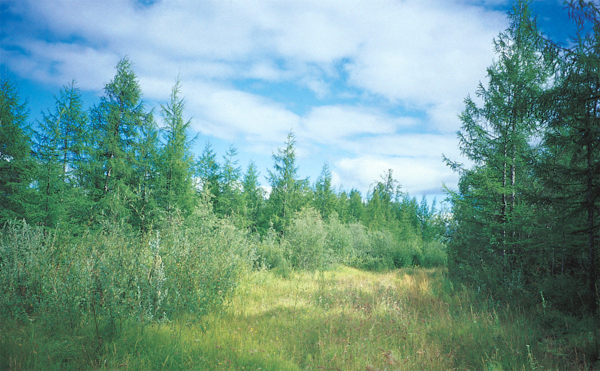 Further south, a change in vegetation indicates a difference in the prevailing climate and conditions. The number of dwarf trees and bushes increases greatly. This is an intermediate zone between tundra and taiga (which many people think of as an individual zone in its own right). Continuing south, the vegetation diversifies. The trees become more numerous and grow much taller. Finally, the environment is that of the taiga – the huge northern forest that cloaks the greater part of Russia.