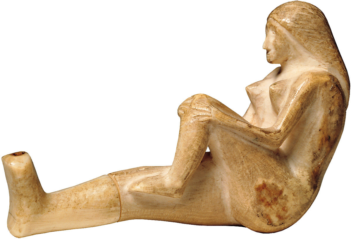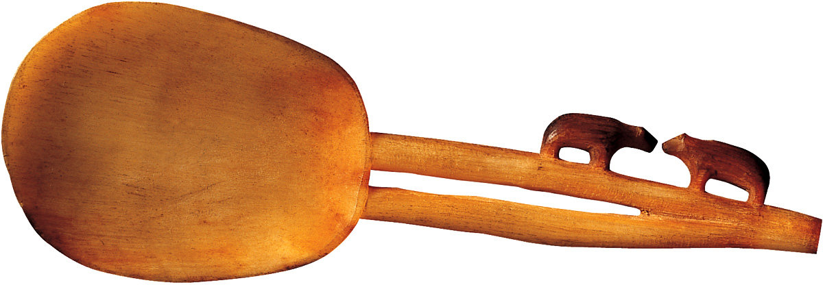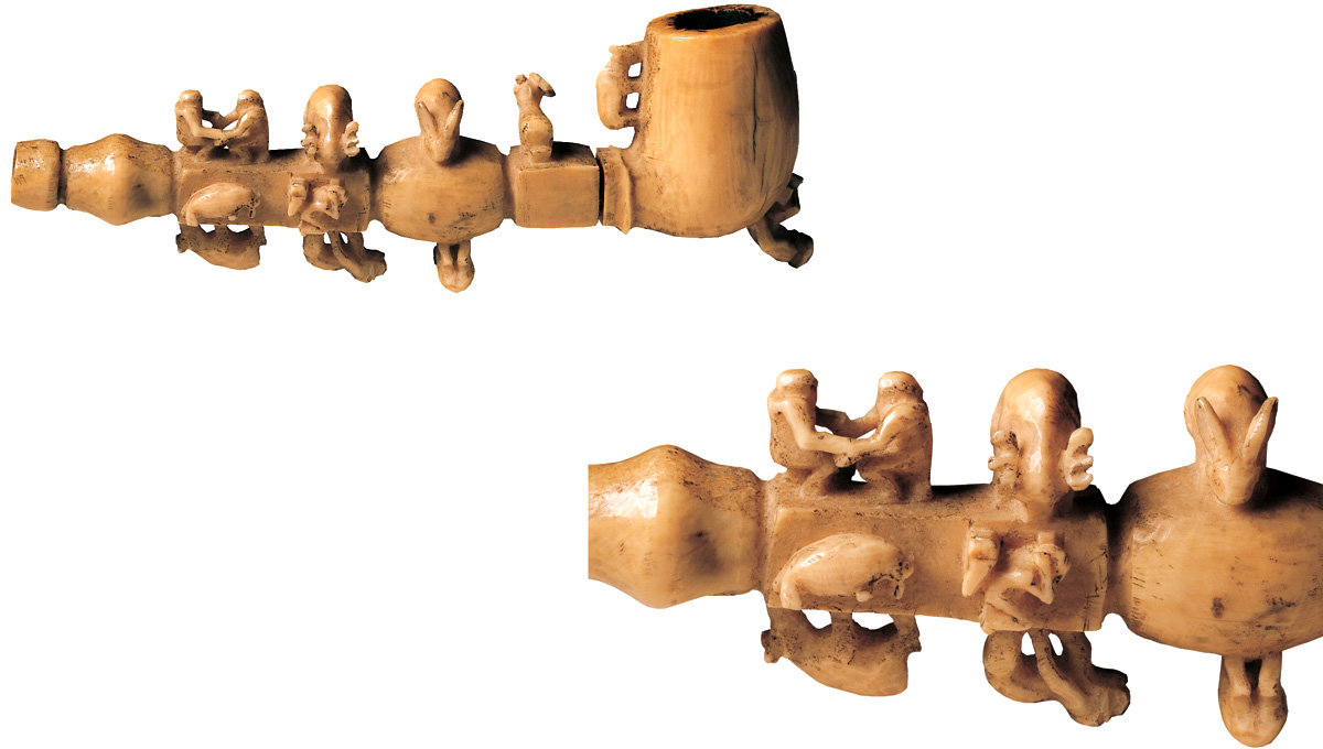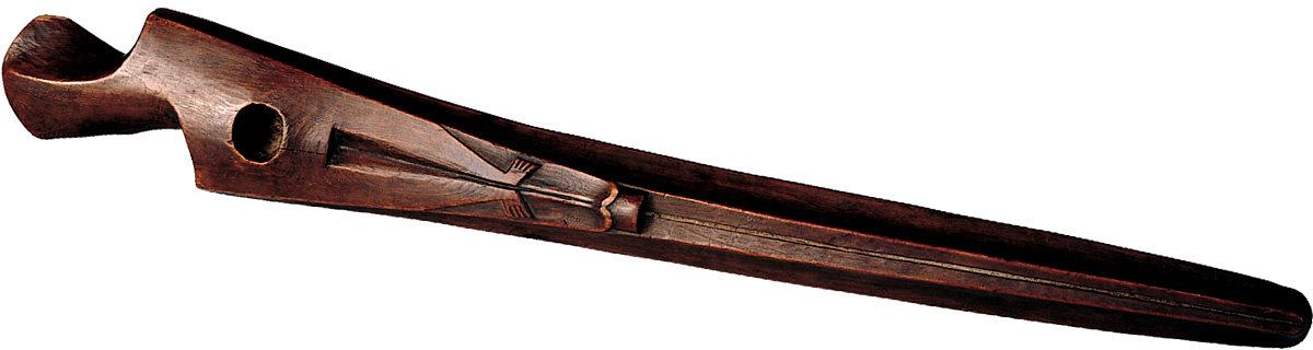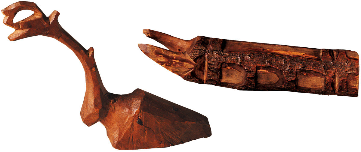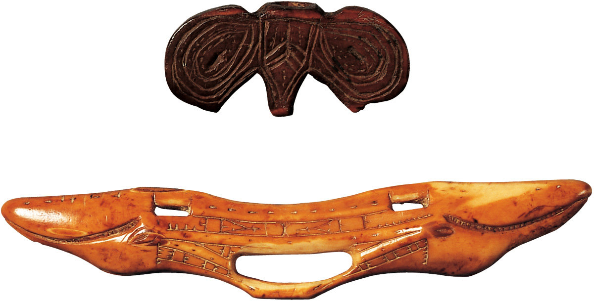 25. ‘Flying object’ and pen. Eskimo (Uit), Chukchi Peninsula, 3rd-4th century AD. Walrus ivory, length: I) 6.2 cm, II) 13.7 cm.