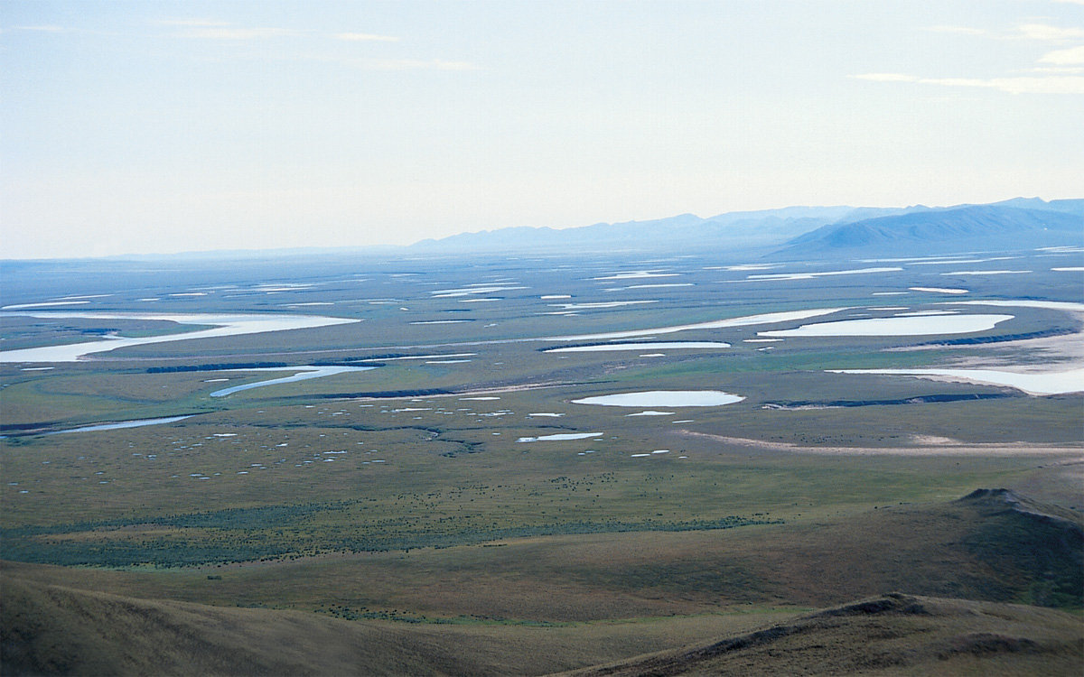 The terrain tends to be marshy, with a scattering of thousands of little lakes of no real depth. Baron Eddel, a traveller who a hundred years or so ago explored the lower reaches of the Indigirka and the Kolyma Rivers, recalled in his memoirs that ‘to draw a map of all these lakes, all you need to do is dip a paintbrush in blue watercolour and bespeckle the paper all over with it’. The tundra is swampy because of the presence beneath the topsoil of permafrost – a stratum of soil frozen solid over thousands of years sometimes to a depth of 1,000 feet (300 metres) or more, whereas the topsoil itself may be no more than a foot (30centimetres) deep. The permafrost is impervious, which means that although annual rainfall may be comparatively low, the water cannot drain away or be absorbed. Nor does it evaporate, because the air is already extremely humid and the heat is not sufficient.