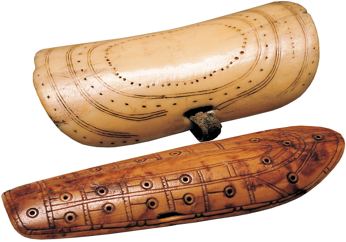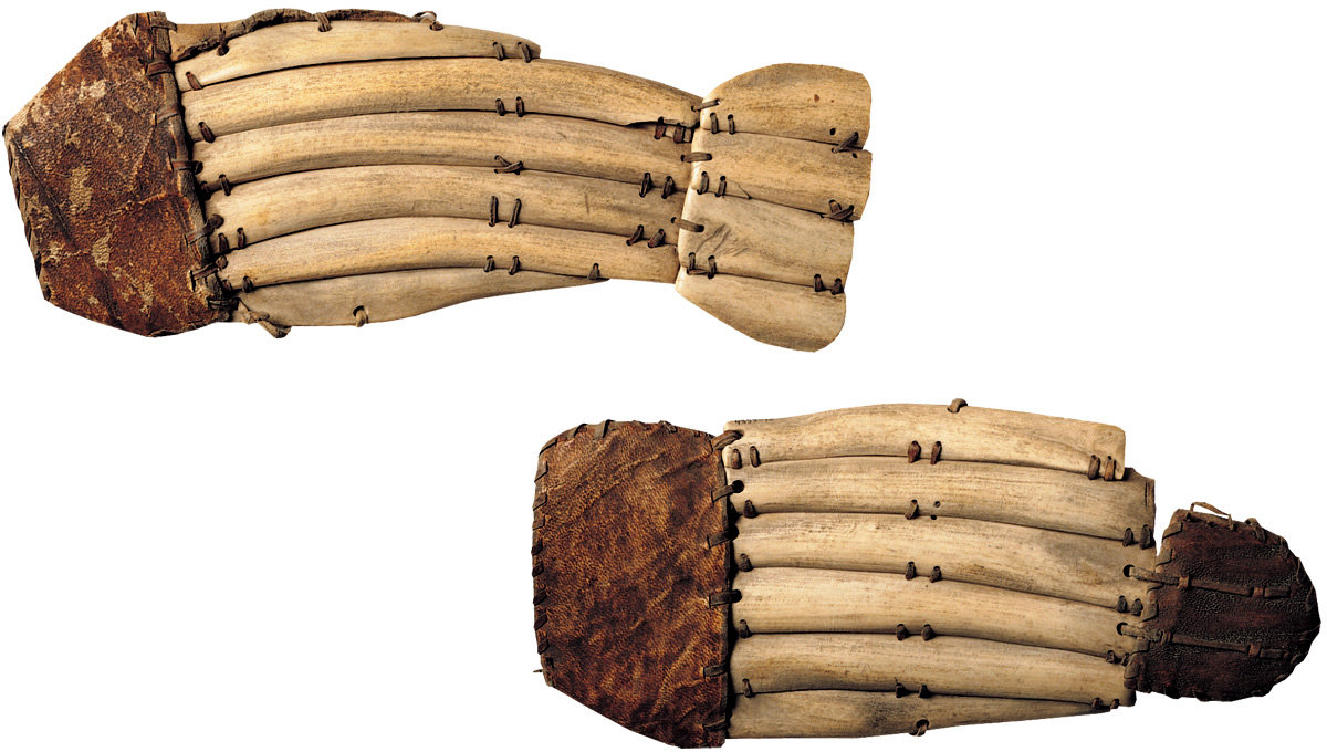 28. Protection for the hands when using a bow and arrow. Chukchi, Uit, Chukchi Peninsula, I) 2nd to 4th century AD, II) 1904-1907. Walrus ivory, skin, length: I) 11.3 cm, II) 13 cm.