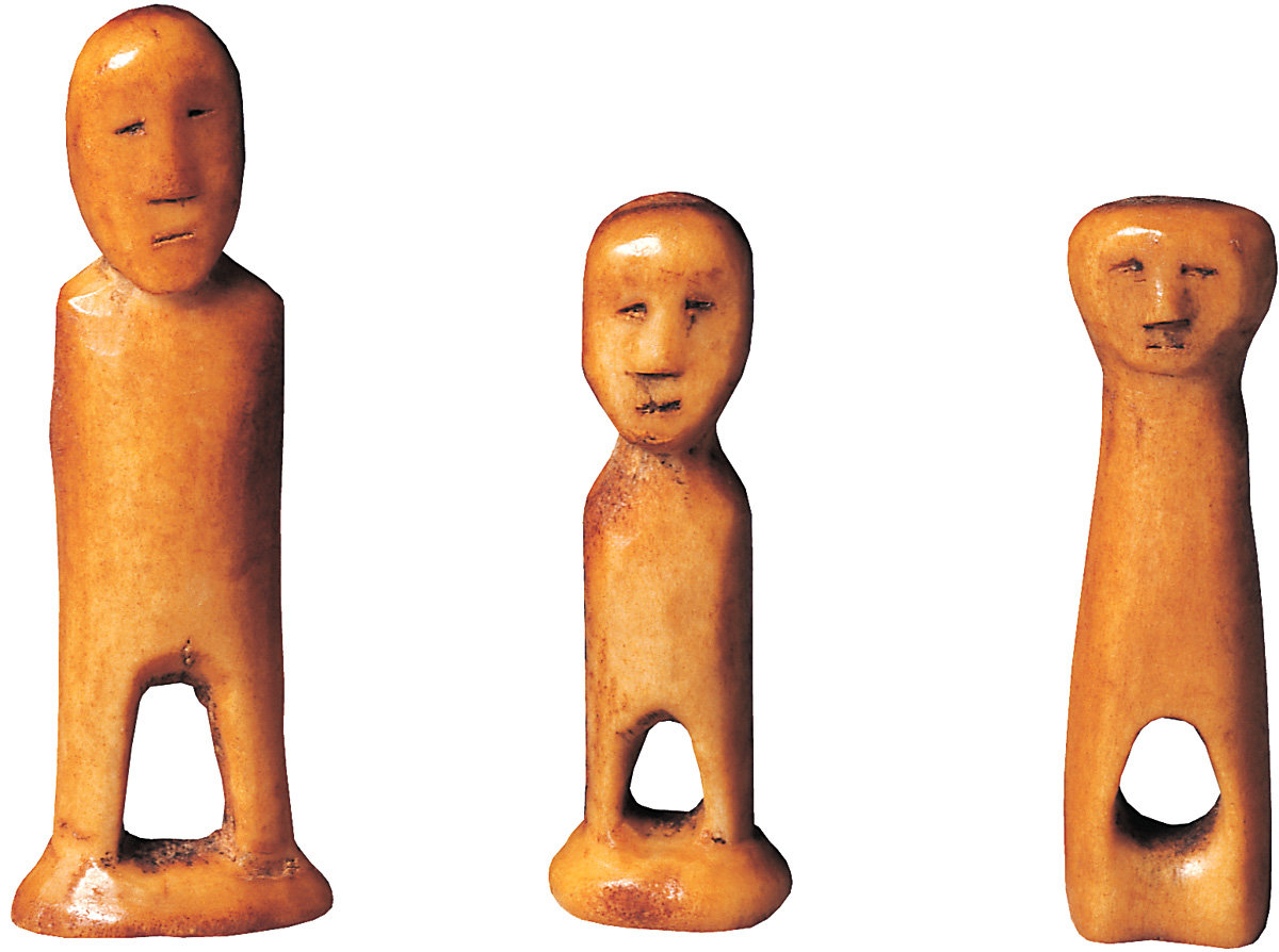 29. Schematic representations of the human form. Eskimo (Uit), Chukchi Peninsula, 3rd-4th century AD. Walrus ivory, height: I) 4.7 cm, II) 3.7 cm, III) 3.8 cm.