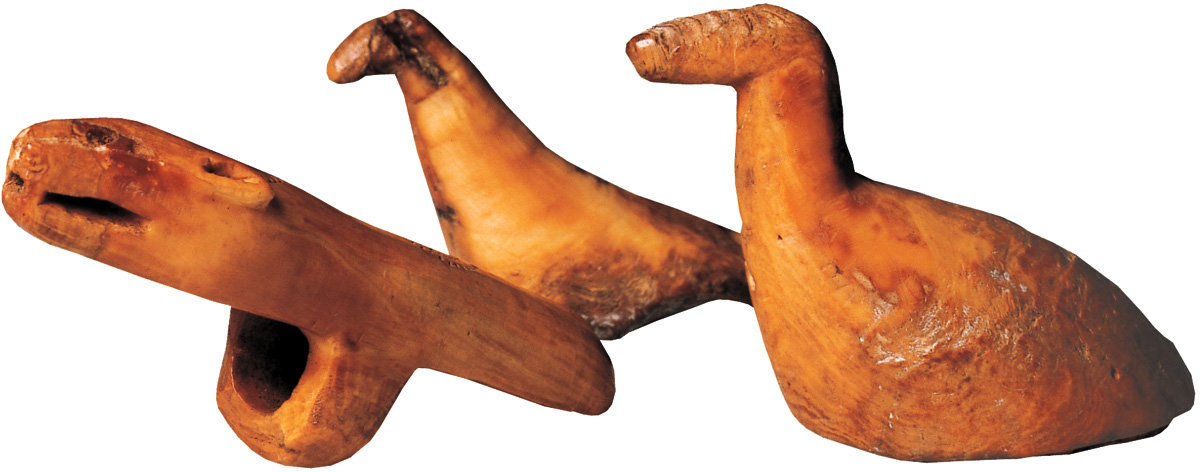 31. Sculpture in miniature: representations of aquatic birds, with a clasp in the form of a bear. Eskimo (Uit), Chukchi Peninsula, 3rd-4th century AD. Walrus ivory. Diameter of the bird figurines: I) 3.2 cm, II) 2.8 cm; height: I) 3.2 cm, II) 3.5 cm; length of the clasp: 5.7 cm.