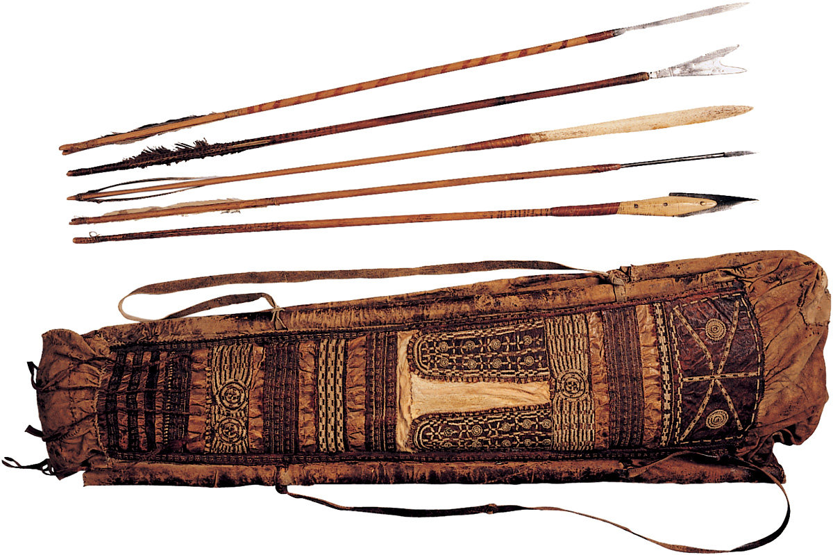 38. Quiver and arrows. Chukchi, the Anadyr area, 1904-1907. Dried sealskin, stitched with reindeer-hide; wood, metal, bone, feathers. Quiver length: 88 cm, width: 21.5 cm; length of arrows: 76.5 cm, 79 cm, 77.3 cm, 76.5 cm.