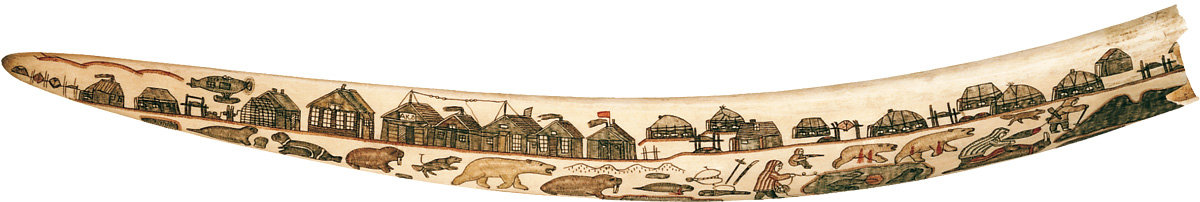 4. Carved walrus tusk, in colour. Fragment, 1930s, Chukchi, Chukotskiy Peninsula. Walrus tusk ivory, 57 x 6 cm.