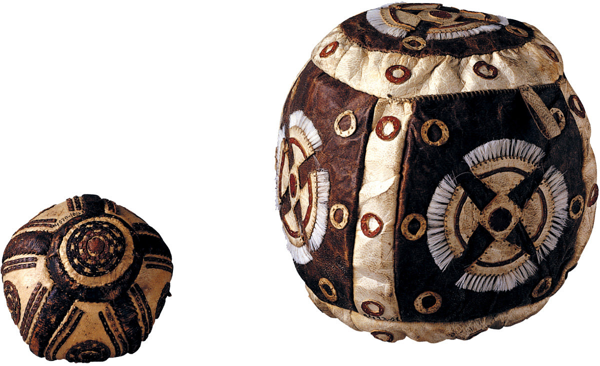 44. Balls for playing games, I) with the feet, II) with the hands. Chukchi, Eskimo (Uit), Chukchi Peninsula, I) 1974, II) 1904-1907. Sealskin and seal hair, stitched with reindeer-hide. Diameter: I) 58 cm, II) 25 cm.