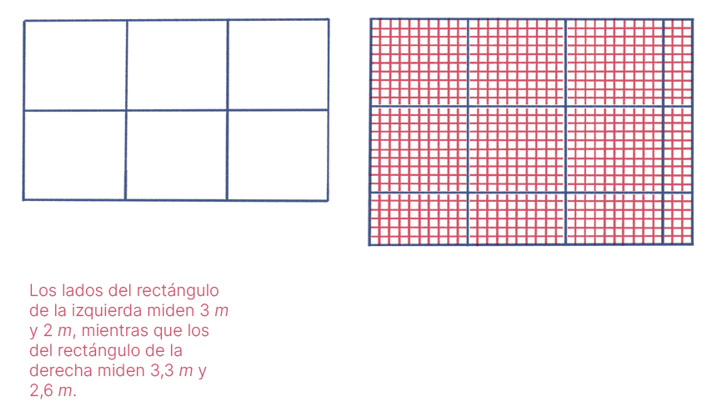 Para comenzar, les explico que el área corresponde a un valor que se le asigna a la amplitud de una región o superficie. ¿Cómo se hace esta asignación de manera natural? Pues bien, si la unidad para medir longitudes es, por ejemplo, el metro, entonces al cuadrado de lado un metro se le asigna naturalmente el valor de un metro cuadrado, que se denota 1 m2. Si ahora se considera un rectángulo de, por ejemplo, lados 3 m y 2 m, este se puede dividir en 3 x 2 = 6 cuadrados de lado 1 m (como en la imagen de abajo a la izquierda). Por lo tanto, lo natural es asignarle un área de 6 m2. Si un rectángulo tiene longitudes más complicadas, como 3,3 m y 2,6 m, entonces se puede dividir en 33 x 26 = 858 cuadrados de lado 0,1 m (tal como se ilustra en la figura de abajo a la derecha). Ahora bien, cada cuadrado de lado 0,1 m tiene área
