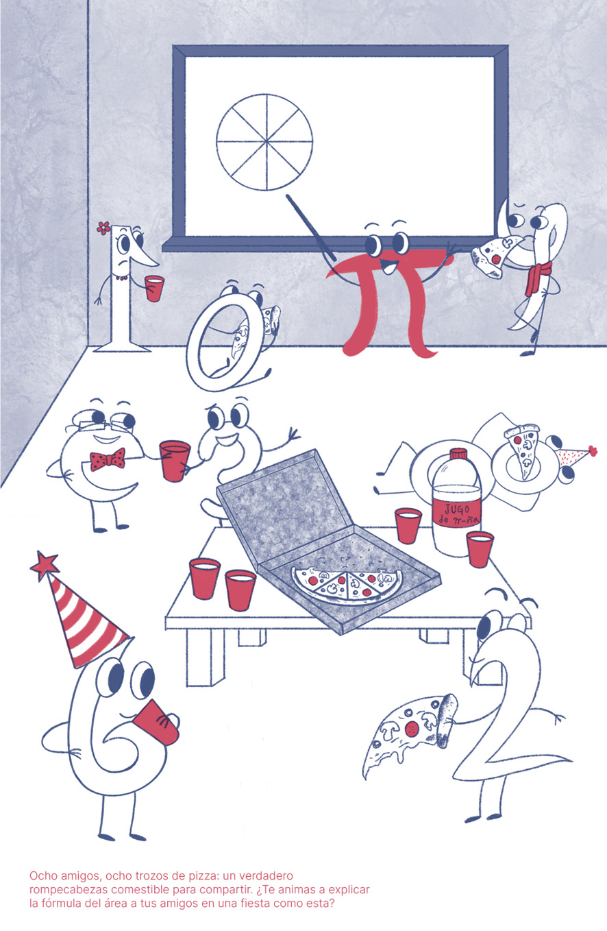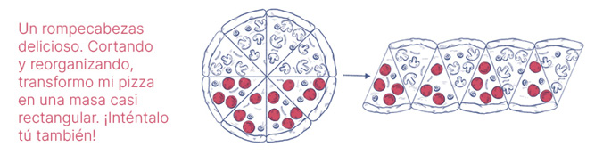 A pesar de este rigor implacable, con el tiempo he aprendido a reconocer que este lenguaje tan preciso de las matemáticas tiene una extraña elegancia. Además, cuando una idea matemática se me vuelve compleja, no logro captar completamente una demostración o, simplemente, si quiero convencerme de que estoy entendiendo bien las cosas, a menudo recurro a mis amigos para compartir opiniones al respecto. Estos encuentros me generan gran entusiasmo: suelo imaginar nuevas formas de entender las cosas y demostrarlas, muchas de ellas más entretenidas que las ya existentes y, por ende, más amenas de enseñar. Una de mis explicaciones favoritas es, precisamente, la de la primera de las fórmulas anteriores, la del área del círculo. Lo sabroso de todo esto es que, desde que descubrimos el sabor de la pizza hace algunos siglos, ¡se las he repetido cientos de veces comiéndonos varias en mi casa!