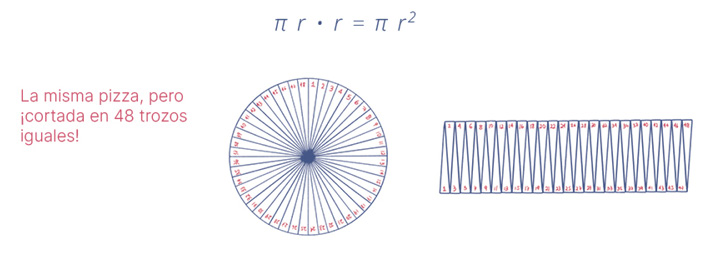 Ahora bien, si este proceso lo repitiera con 48 cortes de pizza para repartirla entre más amigos, entonces la figura que resultaría es prácticamente igual a la de un rectángulo cuya base es la mitad del perímetro del círculo y cuya altura es el radio de este. El área de esta figura sería, entonces, muy próxima a la de dicho rectángulo, cuyo valor no es otro que