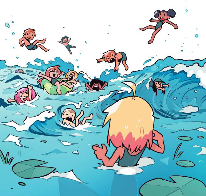 No quise insistir más y fui a unirme al resto del grupo. Pero… ¡por las nubes, aquello no podía estar pasando! Para variar, mis amigos ya la estaban liando. Yuna nadaba al estilo perrito y respiraba con la lengua fuera. Éric no lo hacía mal, pero en lugar de avanzar hacia la otra orilla se había puesto a perseguir a las truchas. Y Nico nadaba como un auténtico tritón; mientras que los demás se encontraban a mitad del recorrido, él ya había ido y vuelto tres veces. ¡Vamos, que aquello era un cante total! Tenía que ir a advertirles de inmediato de que se comportaran como personas. Sin embargo, justo cuando metí un pie en el agua, se oyó un fuerte estruendo y el lago se convirtió en un mar de agitadas olas. Todos comenzaron a gritar. ¿Qué estaba pasando?