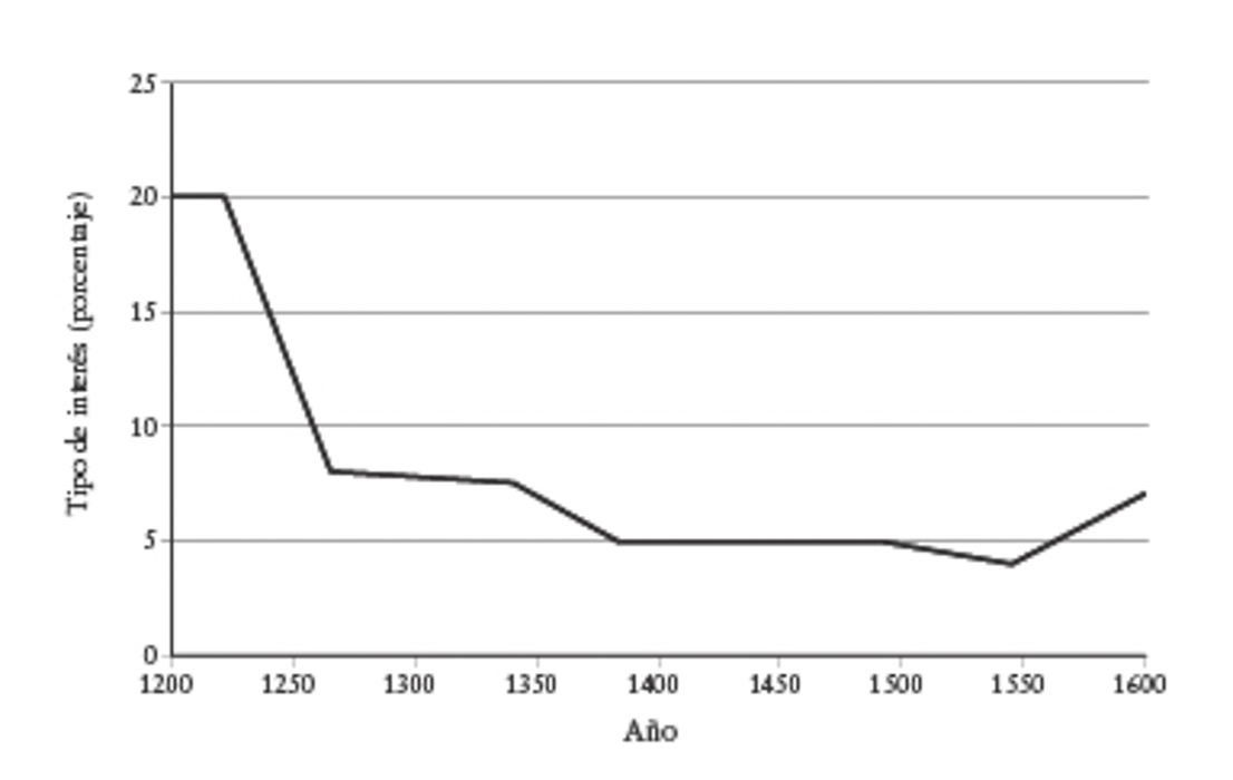 En la Edad Media, estas nuevas prácticas financieras ampliaron la oferta monetaria efectiva y contribuyeron al descenso de los tipos de interés. En el año 1200, los préstamos en el norte de Italia debían cobrar un interés del 20 por ciento. En los tiempos de Datini, los intereses de los préstamos comerciales en Génova habían caído al 7 por ciento. Los comerciantes italianos más respetados obtuvieron así una ventaja competitiva gracias al acceso al crédito barato.31 Como resultado, Datini y sus colegas de la Toscana fueron capaces de expulsar a los comerciantes flamencos de los mercados de Inglaterra y Francia, e incluso vender más barato que ellos en su propio territorio. En el siglo XV, los comerciantes venecianos sólo pagaban un 5 por ciento de interés por sus préstamos.32