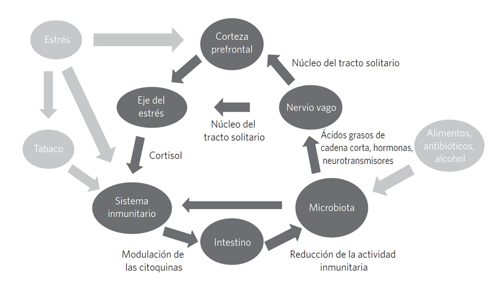 Existe una interacción bilateral entre los intestinos y el cerebro a través del eje del estrés. El cerebro puede provocar una liberación de hormonas del estrés, que aumentarán la permeabilidad intestinal, mientras que la microbiota interactúa con el sistema inmunitario modulando una serie de moléculas que tendrán un impacto sobre el cerebro. Comprender estos mecanismos constituye un reto determinante para la salud mental.