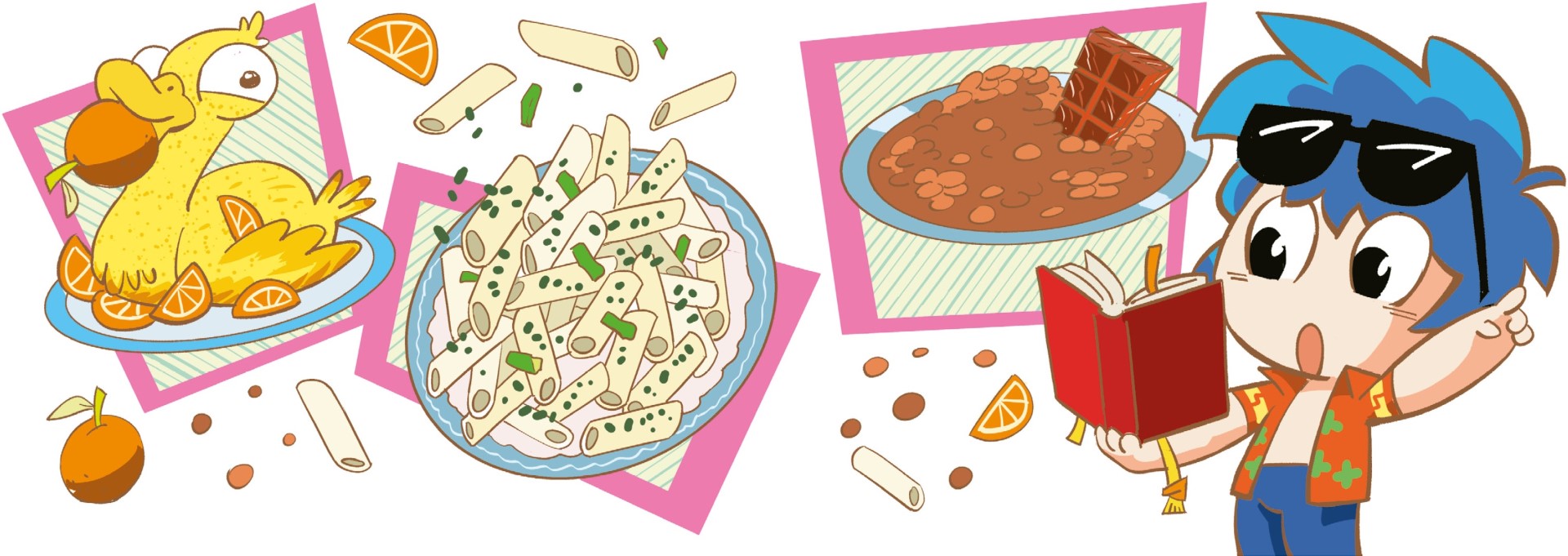 —A ver, ¿pato a la naranja?… No. ¿Macarrones a la carbonara?... Tampoco. Ah… ¡Aquí están! ¡Lentejas con chocolate!
